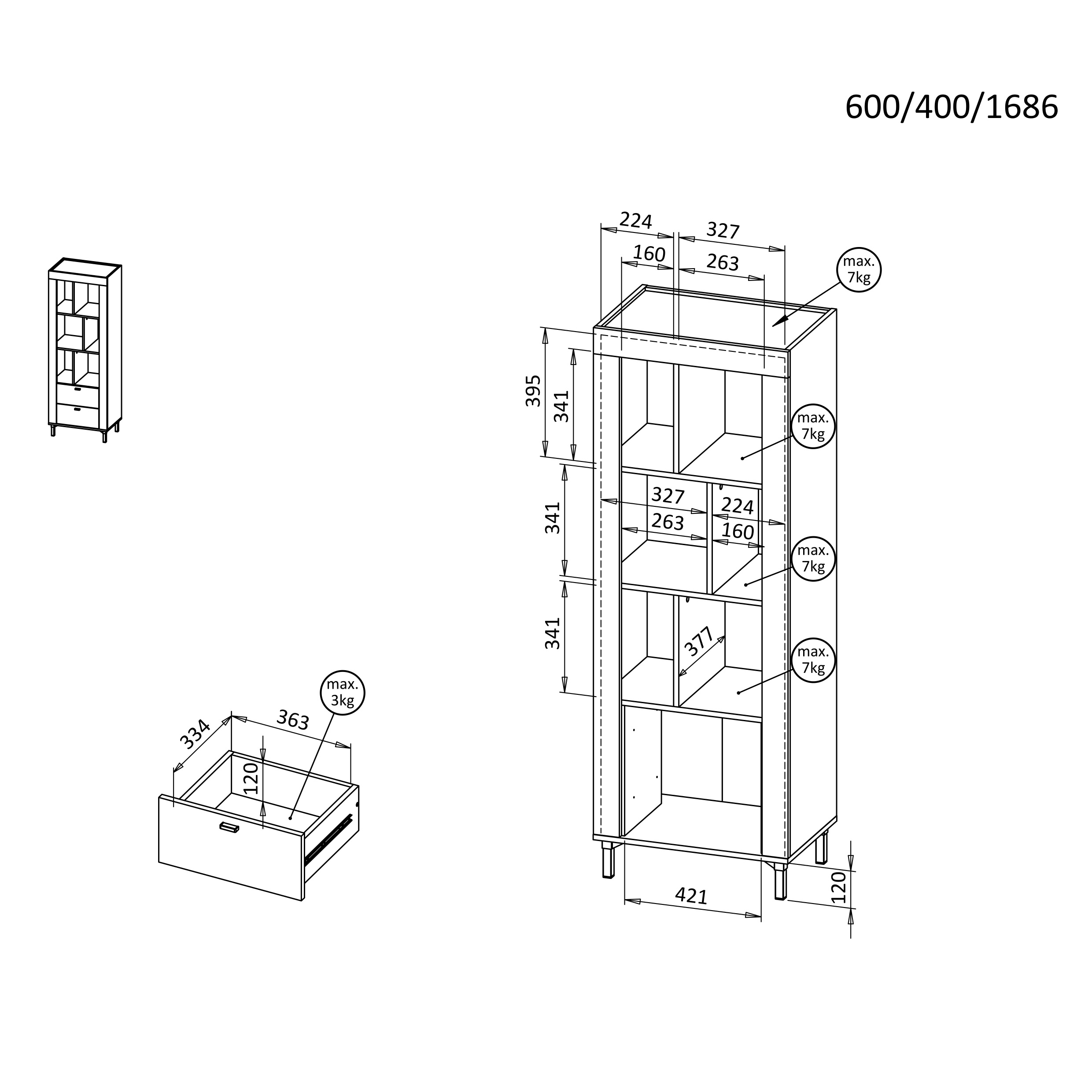 - Spousta úložného prostoru: Šest otevřených polic nabízí dostatek prostoru pro knihy, dekorace nebo rostliny, zatímco dvě zásuvky poskytují další úložný prostor pro menší předměty.