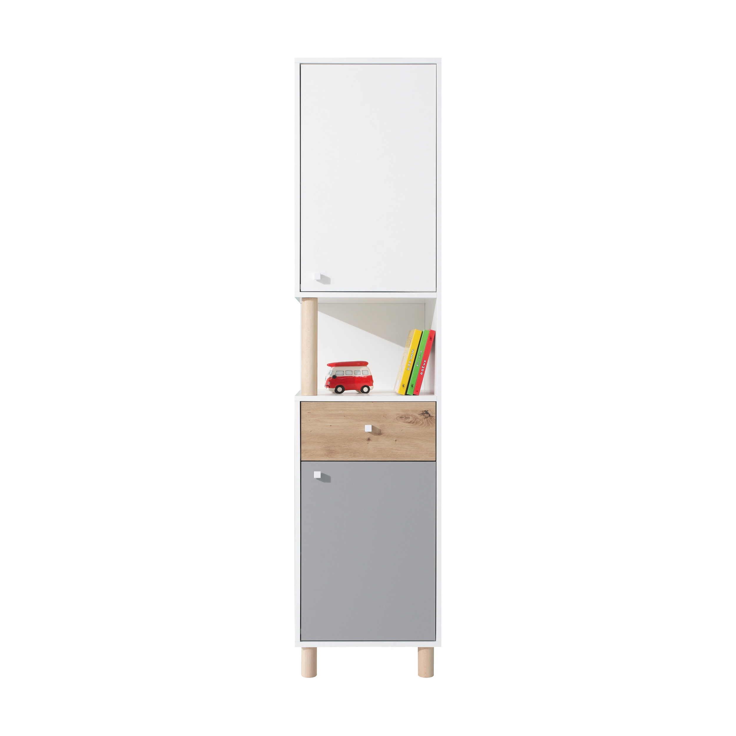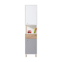 Knihovna FIGO kombinuje úložný prostor, funkčnost a moderní design v kompaktním kusu nábytku. S rozměry 45 × 40 × 190 cm se perfektně hodí do pokojů pro teenagery, bytů nebo malých obytných prostor a nabízí dostatek prostoru pro knihy, dekorace a předměty denní potřeby. Promyšlené uspořádání: Dvoje dveře poskytují uzavřený úložný prostor pro osobní věci, zatímco praktická zásuvka nabízí prostor pro menší předměty. Otevřené přihrádky stylově vystavují knihy a dekorativní předměty. Vysoce kvalitní materiály – Tělo z 16mm laminované desky je odolné a snadno se čistí. Doplňují ho elegantní kovové úchyty a robustní dřevěné nohy, které zajišťují robustnost a pohodlí. Moderní design – Barevná kombinace řemeslného dubu, bílé a šedé dodává polici moderní vzhled, který se bez námahy hodí do různých stylů interiérového designu. Úspora místa a funkčnost – Štíhlé rozměry činí polici ideální do malých prostor, zatímco chytré uspořádání zajišťuje maximální organizaci v malém prostoru. Knihovna FIGO se 2 dvířky a 1 zásuvkou zaujme svou praktickou funkčností, moderním designem a solidním zpracováním. Všestranný kus nábytku, který poskytuje