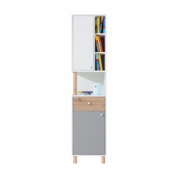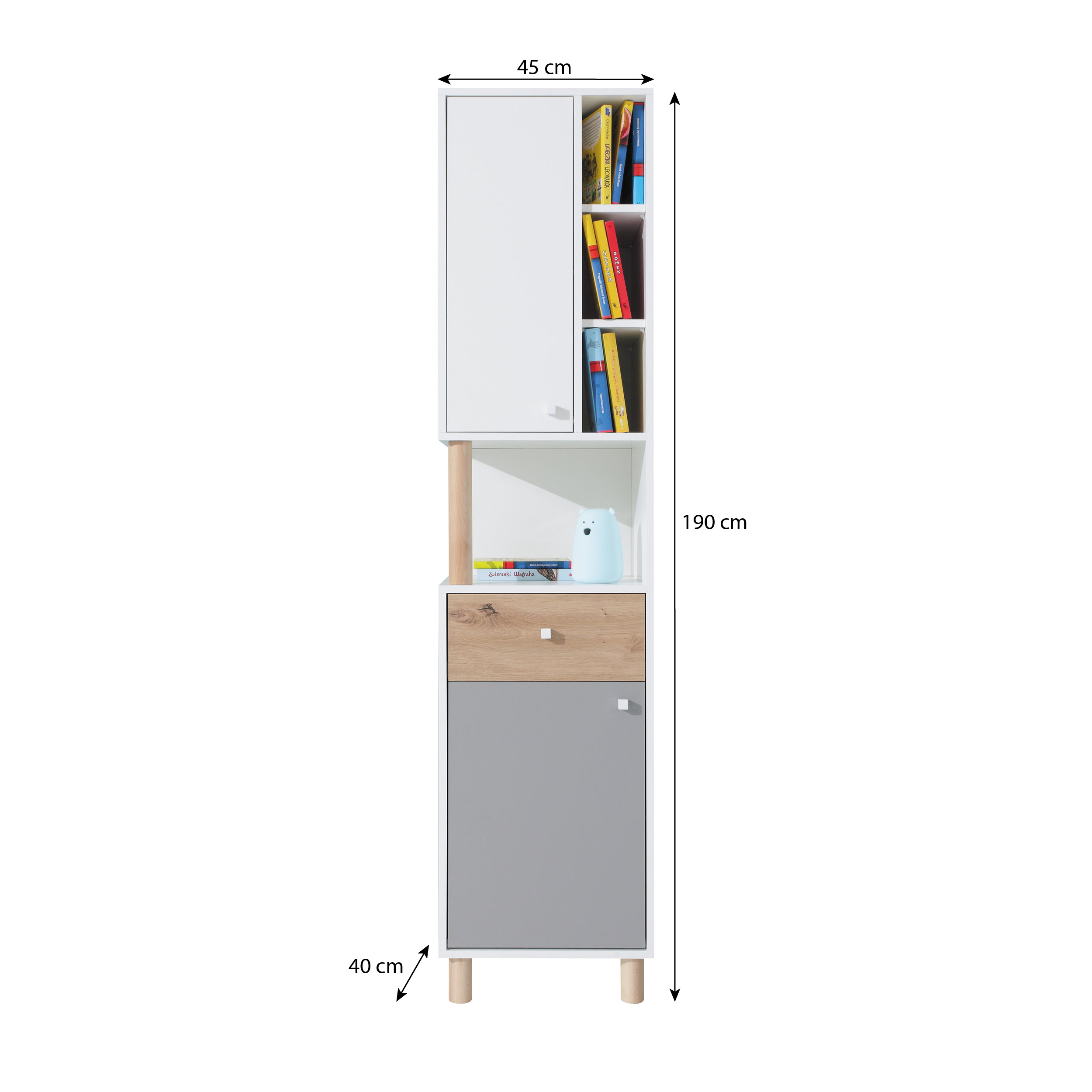 Knihovna FIGO kombinuje praktický úložný prostor, moderní design a vysokou funkčnost v kompaktním kusu nábytku. S rozměry 45 × 40 × 190 cm je ideální do pokojů pro teenagery, bytů nebo menších obytných prostor a nabízí prostor pro knihy, dekorace nebo osobní věci. Chytře rozdělená – Police má dvoje dvířka poskytující uzavřený úložný prostor a také jednu zásuvku na drobnosti. Otevřené police elegantně vystavují knihy a dekorace. Vysoce kvalitní materiály – Rám z 16mm laminované desky zaručuje odolnost, zatímco kovové úchyty a robustní dřevěné nohy poskytují větší pohodlí a stabilitu. Moderní design – Kombinace dubu Artisan, bílé a šedé barvy dodává poličce moderní vzhled, který doplní jakýkoli styl. harmonicky se hodí do různých stylů interiérového designu.