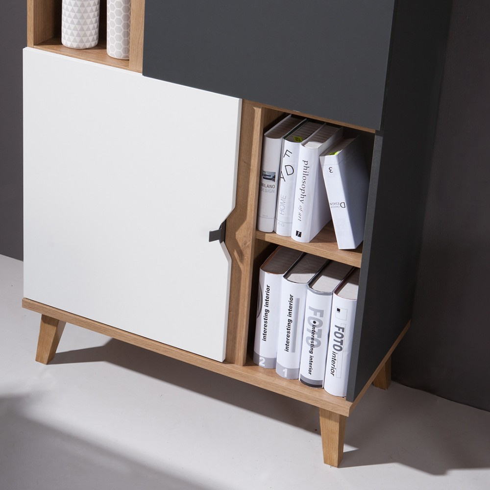 Knihovna Moreno kombinuje funkční design s moderní estetikou a nabízí dostatek úložného prostoru pro knihy, školní potřeby nebo dekorace. Díky třem dvířkům a šesti policám zajišťuje dokonalý pořádek a přehlednost – ideální do pokojů pro teenagery, pracovních prostorů nebo obývacích pokojů. Stylové barevné provedení v odstínech zlatý dub, matná bílá a grafit vnáší do každé místnosti teplo a modernitu, zatímco kovové úchytky a ABS hrany zaručují vysokou kvalitu a odolnost nábytku. podtrženo.