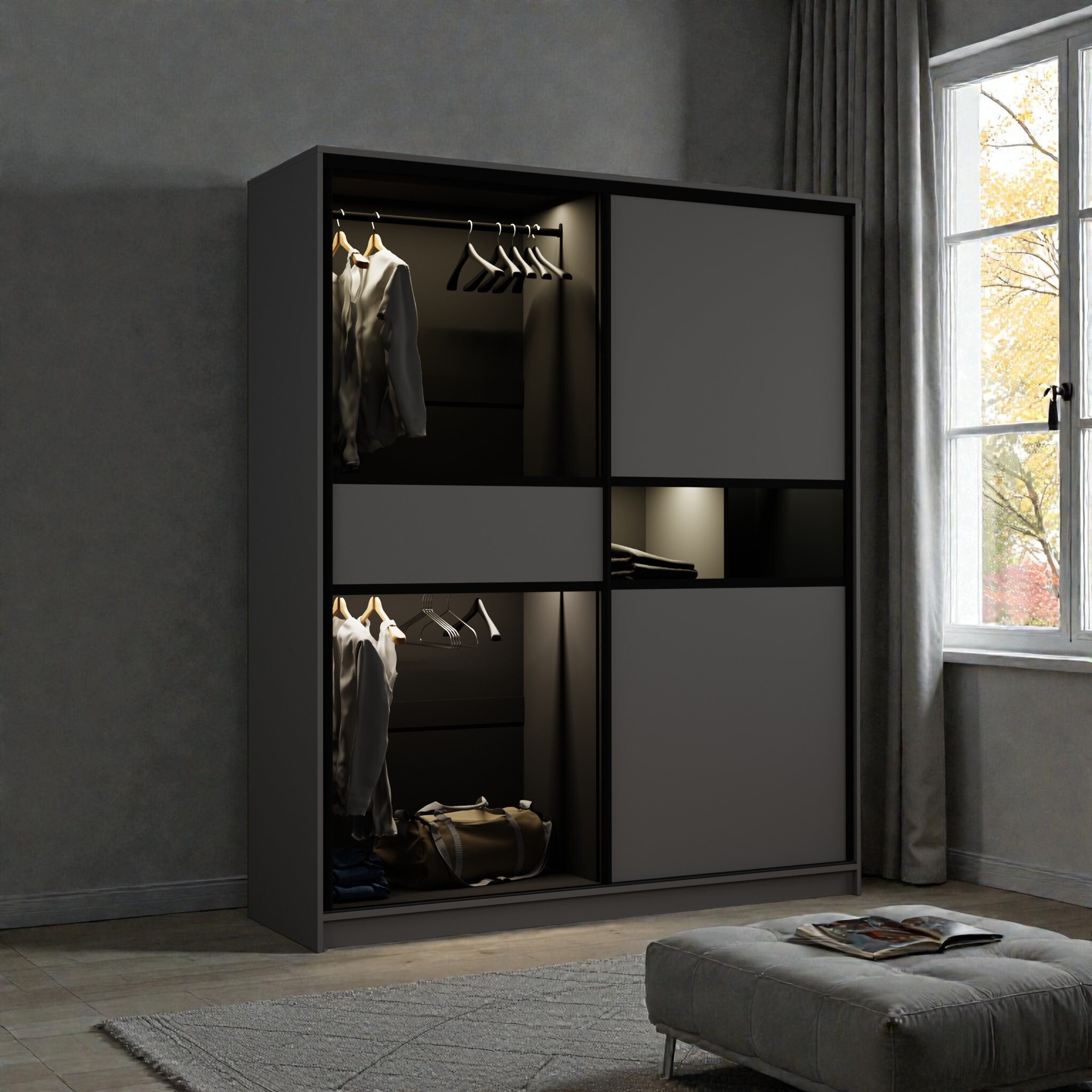 Hledáte spojení nekompromisního úložného prostoru a moderního designu? Tato šatní skříň v elegantním grafitovém provedení s detaily z černého dekorativního skla se stane dominantou vaší ložnice či předsíně. Díky velkorysým rozměrům a inovativnímu ovládání osvětlení představuje špičku ve své kategorii.