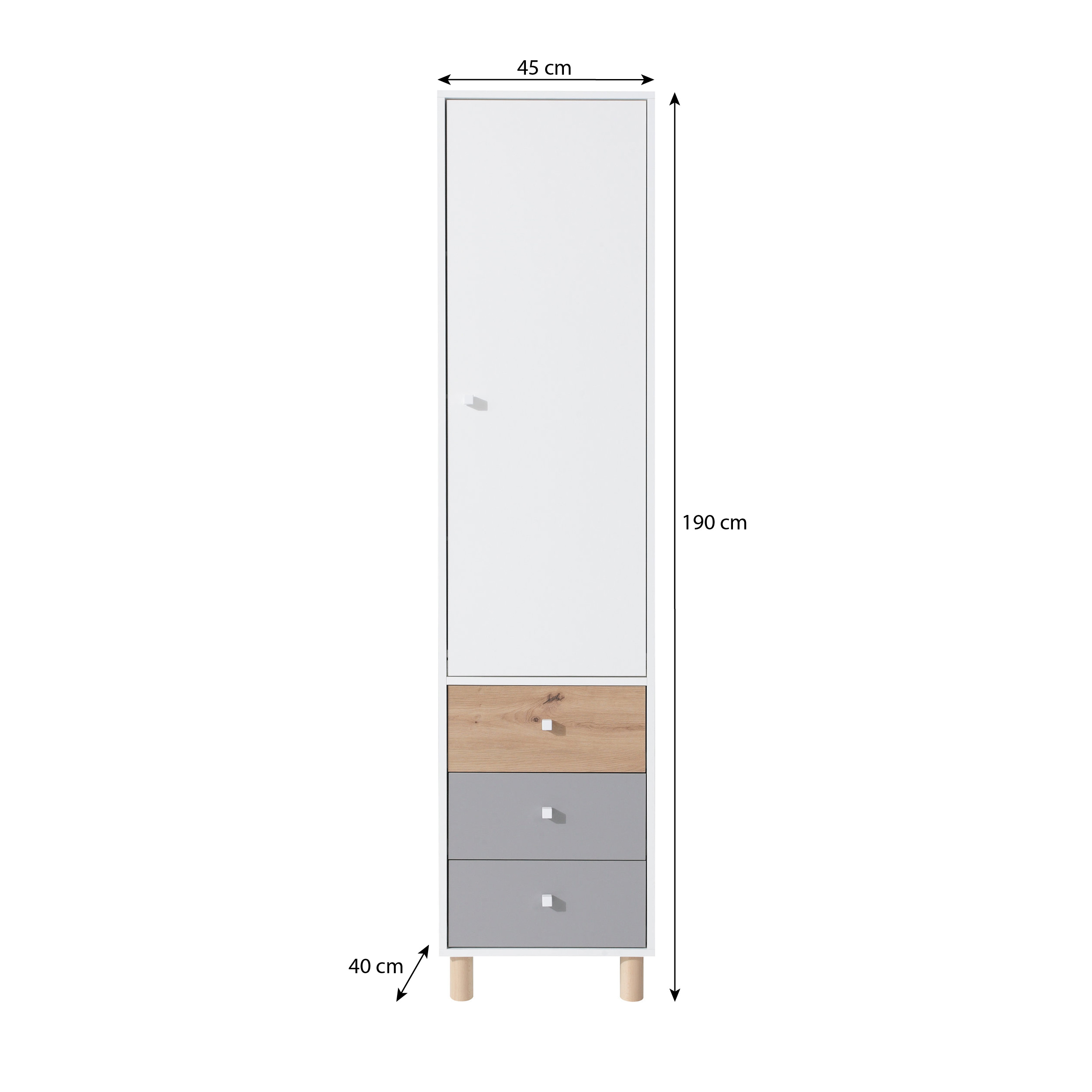 Šatní skříň FIGO kombinuje moderní design, praktické uspořádání a vysoce kvalitní zpracování. Díky svým kompaktním rozměrům 45 × 40 × 190 cm se perfektně hodí do pokojů pro teenagery nebo menších prostor, kde je potřeba dostatek úložného prostoru na malém prostoru. Funkční uspořádání – Šatní skříň má jedny dveře s úložným prostorem na oblečení nebo větší předměty a také tři prostorné zásuvky, které nabízejí místo na ložní prádlo, doplňky nebo další předměty. Vysoce kvalitní materiály – Korpus vyrobený z 16mm laminované desky je odolný a snadno se o něj pečuje. Konstrukci doplňují kovové úchyty a robustní dřevěné nohy, které zajišťují bezpečné postavení.