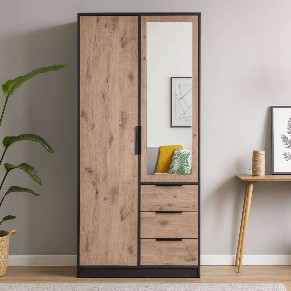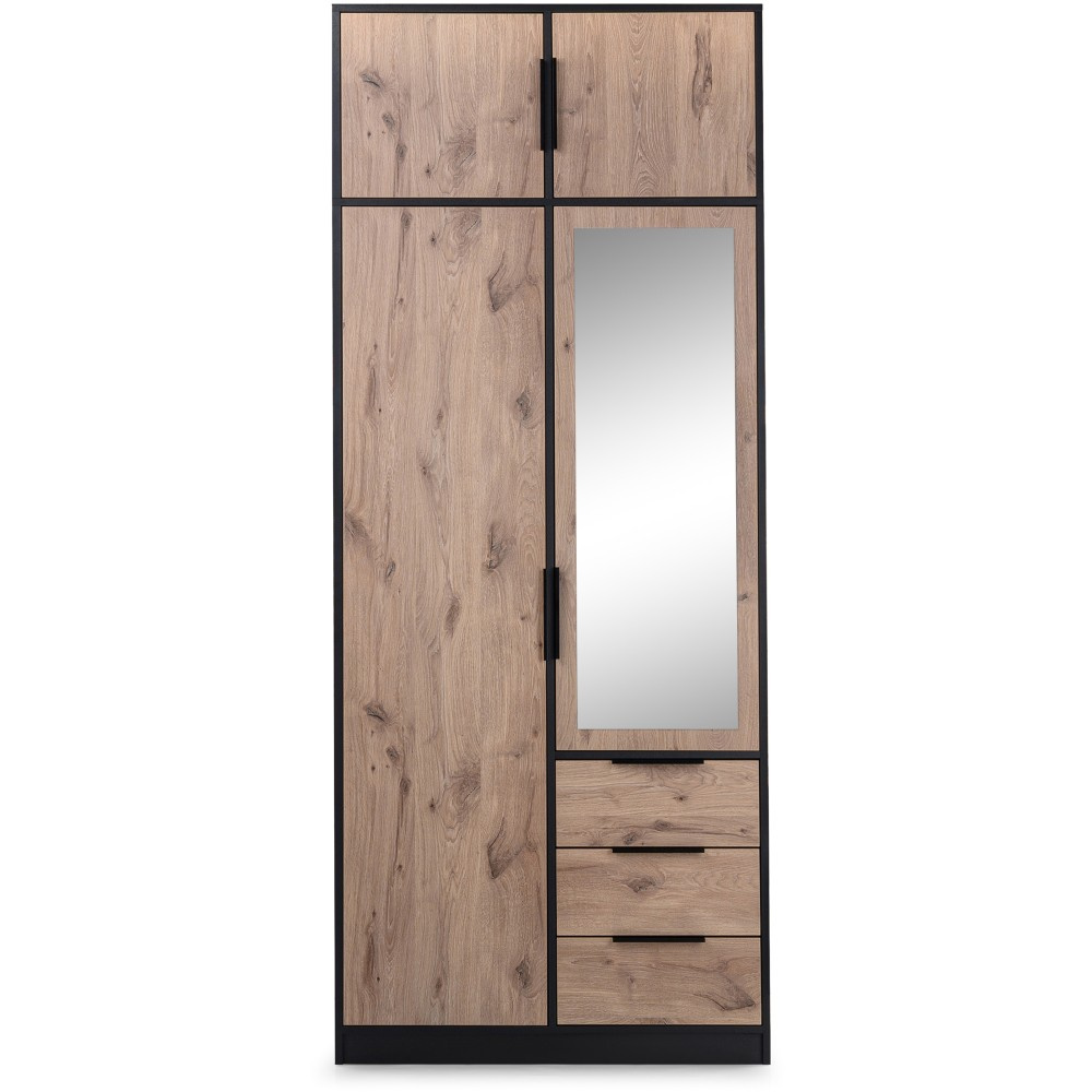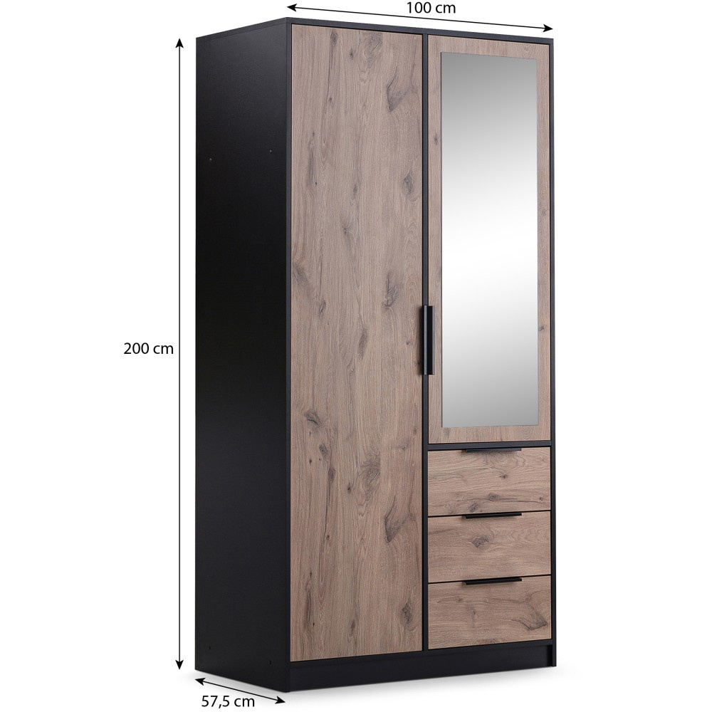 Černá + vikingský dub dodává šatní skříni výrazný, moderní charakter a dělá z ní ideální volbu do ložnic, pokojů pro teenagery nebo šaten. Dvoje dveře s panty – Umožňují pohodlný přístup do celého interiéru a zajišťují klasické a funkční využití. Tři prostorné zásuvky – Ideální pro uložení prádla, doplňků nebo menších předmětů denní potřeby – vše úhledně uspořádané a snadno dostupné. Uvnitř šatní tyč – Ideální pro zavěšení bund, košil nebo šatů. Laminovaná deska s ABS hranami – Robustní povrch je odolný vůči poškození a obzvláště snadno se čistí. Volitelné rozšíření skříňky – Skříňku lze rozšířit pomocí rozšíření, čímž se získá další úložný prostor až ke stropu. Rozměry: pl_text-expander--expanded">