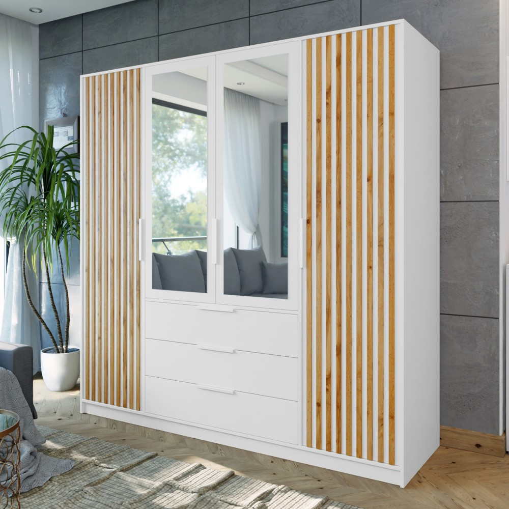 Šatní skříň BUENO LUX se 4 dveřmi a 3 zásuvkami kombinuje moderní design s praktickou funkčností. Díky dekorativním lamelám a integrovaným zrcadlům vpředu se stane ústředním bodem každé ložnice. Harmonická barevná kombinace a promyšlené vnitřní uspořádání vytvářejí esteticky příjemné a pohodlné obytné prostředí. 4 výklopné dveře – Nabízejí dostatek úložného prostoru pro oblečení, ložní prádlo a doplňky. Dobře navržená vnitřní struktura umožňuje přehledné a organizované ukládání. 3 praktické zásuvky – Ideální pro menší předměty, jako jsou textilie, spodní prádlo nebo doplňky. Vytvářejí další úložný prostor a zajišťují pořádek v každodenním životě.