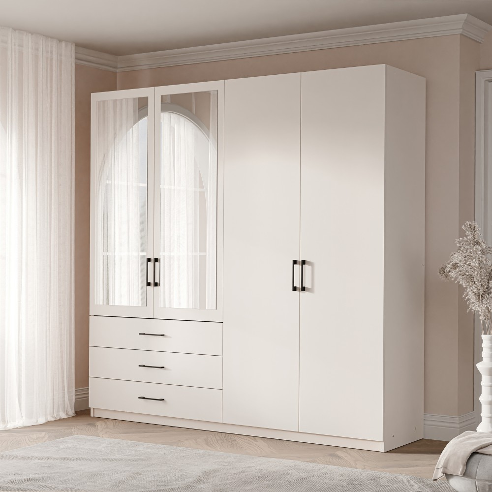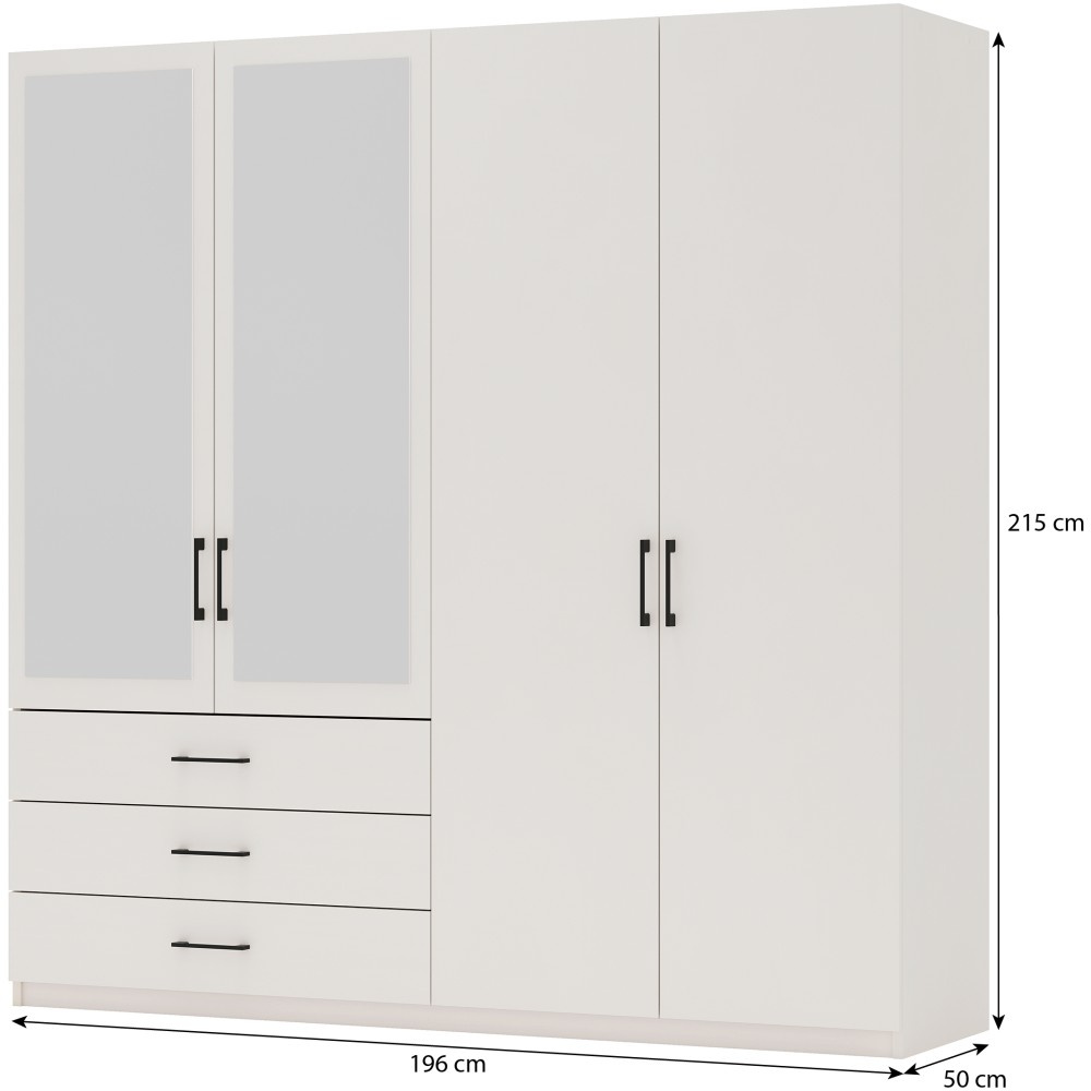 S rozměrem Šatní skříň PURA o rozměrech 196×50×215 cm nabízí dostatek úložného prostoru v kompaktním provedení. Kombinace zásuvek, polic a šatních věšáků z něj činí velmi praktické a všestranné řešení – ideální pro každého, kdo oceňuje pořádek a moderní design.