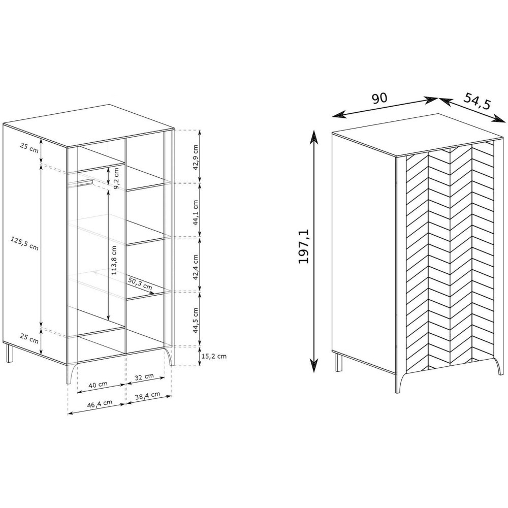 Šatní skříň ze stylové kolekce LUME kombinuje pokročilé technologie s čistým, nadčasovým designem. Dvoje dveře s panty jsou vybaveny praktickým systémem otevírání push-to-open, který nevyžaduje žádné kliky a umožňuje plynulé otevírání lehkým zatlačením. Díky integrovanému mechanismu tlumeného zavírání se dveře zavírají tiše a jemně, což zajišťuje nejen pohodlí, ale také prodlužuje životnost pantů. Uvnitř najdete robustní šatní věšák, ideální pro zavěšení vašich oblíbených oděvů, a také pět polic, které nabízejí dostatek úložného prostoru pro složené oblečení, boty a doplňky. Tato šatní skříň je vyrobena z vysoce kvalitní dřevotřísky s odolným melaminovým povlakem, takže se snadno udržuje a je robustní. Díky minimalistickému a elegantnímu designu je ideálním společníkem do moderních ložnic nebo šaten. Je synonymem pro inovativní funkčnost, vysoce kvalitní zpracování a pohodlné používání – stylové řešení, které dodá vašemu domovu strukturu a eleganci.