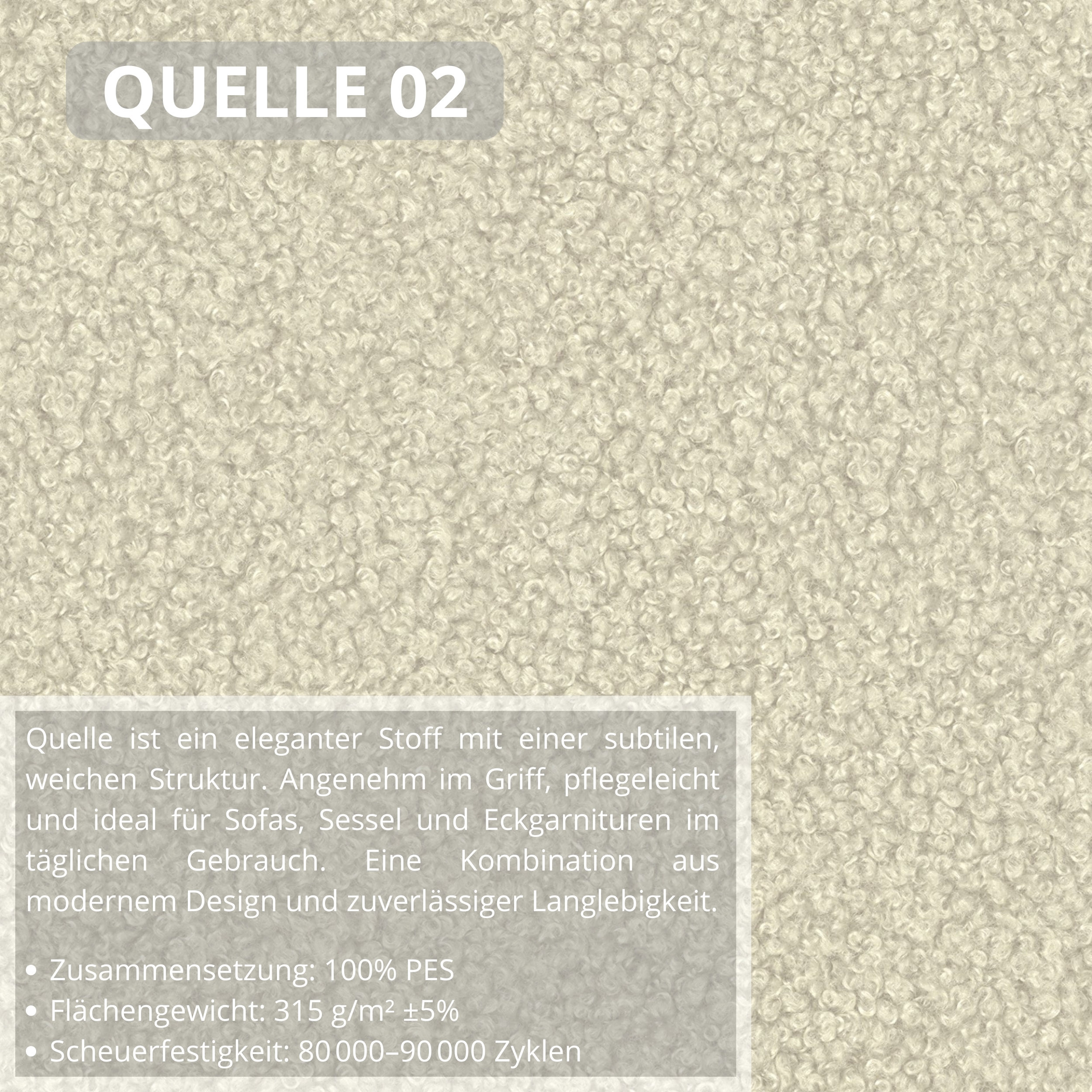 SOURCE – se vyznačuje unikátní strukturou bouclé, často označovanou jako „jehněčí kůže“. Jeho měkká, hebká textura dodává interiérům jedinečný charakter a eleganci, takže se hodí jak do klasického, tak i moderního prostředí. Vezměte prosím na vědomí, že všechny rozměry čalouněného nábytku podléhají toleranci +/- 2 %. Snažíme se zobrazit barvy co nejpřesněji. Upozorňujeme však, že v důsledku nastavení monitoru a grafické karty se mohou vyskytnout drobné odchylky. Toto není důvod k reklamaci. Kromě toho se barvy různých sérií látek mohou mírně lišit v odstínu. Dodání je možné na adresy v rámci Německa. Nedodáváme na ostrovy ani do horských oblastí. Využíváme vlastní bezpečnou a efektivní přepravní službu. O datu dodání budete předem informováni.