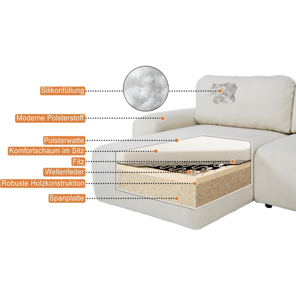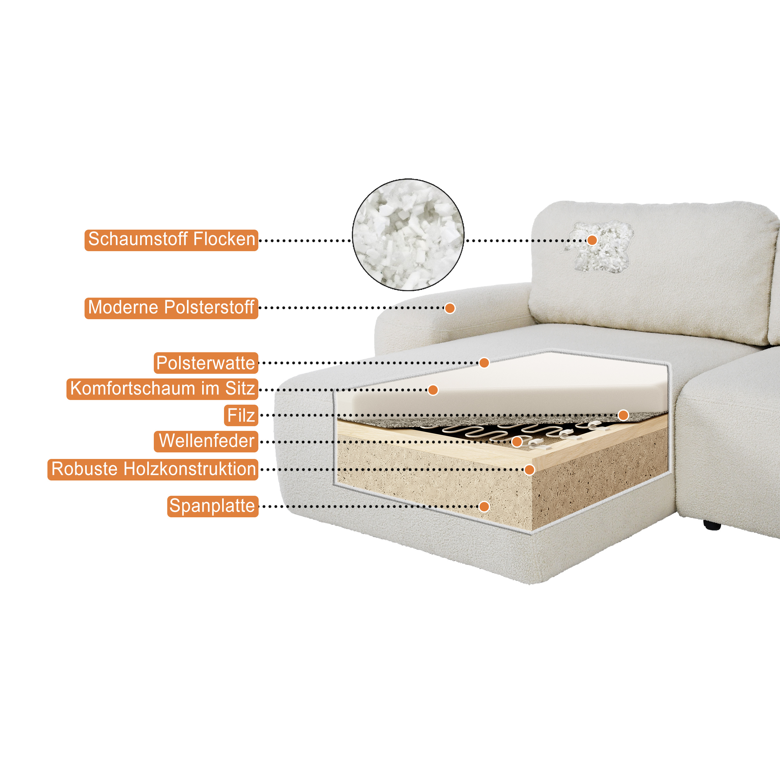 Rohová pohovka NOEL kombinuje moderní design, vysoký komfort sezení a praktickou funkčnost. Díky univerzálnímu taburetu se flexibilně přizpůsobí jakémukoli konceptu místnosti a stane se stylovým ústředním bodem vašeho obývacího pokoje. Ideální pro útulné večery, odpočinkové chvíle nebo spontánní přenocování hostů. Výhody v kostce: Sedák s vlnitými pružinami a pěnou T-30/100 - Kombinace vlnitých pružin a vysoce kvalitní pěny zajišťuje odolný a pohodlný zážitek ze sezení, který zůstává příjemný i po delším sezení. Konstrukce z masivního dřeva - Pro stabilní a dlouhotrvající používání – pohovka odolává každodennímu opotřebení a nabízí bezpečnou základnu.