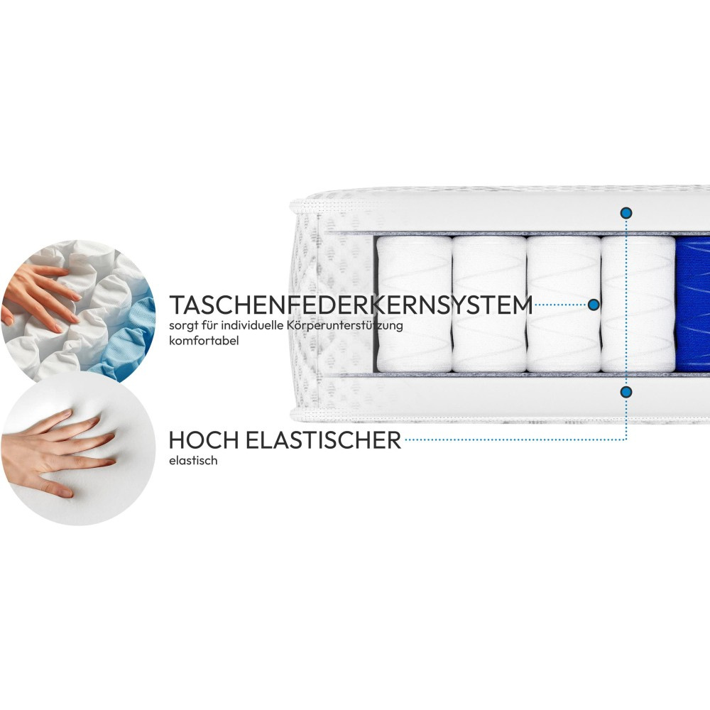 Matrace je **inteligentně rozdělena do zón**, které jemně podpírají **citlivá ramena** a **hlavu** a zároveň poskytují oporu pro bederní oblast a kyčle. Tím je zajištěno přirozené vyrovnání páteře a výrazná úleva od bolestí zad a kloubů. Vysoká bodová flexibilita: Stovky pružin pracují nezávisle na sobě a reagují přesně v tlakových bodech. Každá část těla je individuálně podepřena a pohyby osoby se nepřenášejí na druhou stranu postele. To zaručuje pohodlný a klidný spánek po celou noc.