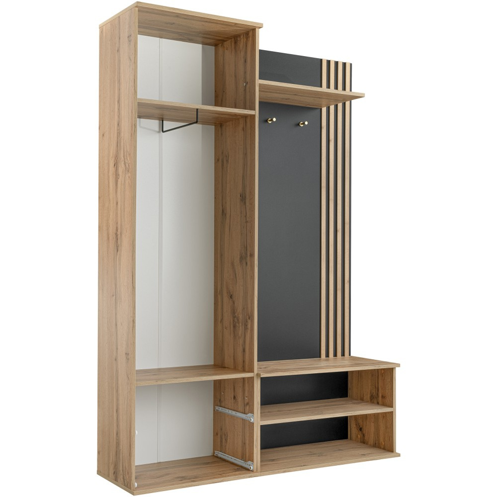 Šatní skříň LUNO kombinuje praktickou funkčnost s moderním designem. Vyrobena z vysoce kvalitní dubové desky Wotan, vnese do vaší chodby nebo vstupního prostoru teplo a přirozenost. Díky sezení, zásuvkám, šatní tyči a velkému zrcadlu je ideálním řešením pro uklizený a stylový domov. Praktické posezení - Integrované sezení umožňuje pohodlné nazouvání a zouvání bot. Nabízí pohodlí a zajišťuje praktické využití vstupního prostoru. Velké zrcadlo - Zrcadlo je ideální pro poslední pohled před odchodem z domu a opticky zvětšuje místnost, díky čemuž chodba vypadá světlejší a otevřenější. Skříň s šatní věšákem - Šatní věšák poskytuje prostor na bundy, kabáty a šály. V kombinaci se dvěma policemi můžete úhledně uložit oblečení a doplňky. Dvě praktické zásuvky jsou ideální pro menší předměty, jako jsou klíče, rukavice nebo klobouky. Válečkové vedení umožňuje plynulé a tiché otevírání. Skříň LUNO je perfektní kombinací praktického úložného prostoru, pohodlného používání a moderního designu. Díky sezení, zrcadlu, zásuvkám, šatní věšáku a policám vnese do vaší chodby řád, pohodlí a styl. Vyberte si LUNO – a začněte každý den organizovaně a elegantně. Rozměry: Rádi bychom vás informovali, že všechny rozměry čalouněného nábytku mají toleranci +/- 2 %. Snažíme se zobrazit všechny barvy co nejpřesněji. Upozorňujeme však, že v důsledku nastavení monitoru a grafické karty se mohou vyskytnout drobné odchylky. Toto není důvod k reklamaci. Kromě toho se barvy různých sérií látek mohou mírně lišit v odstínu. Dodání je možné na adresy v rámci Německa. Nedodáváme na ostrovy ani do horských oblastí. Disponujeme vlastní bezpečnou a rychlou přepravní službou. O datu dodání budete předem informováni.
