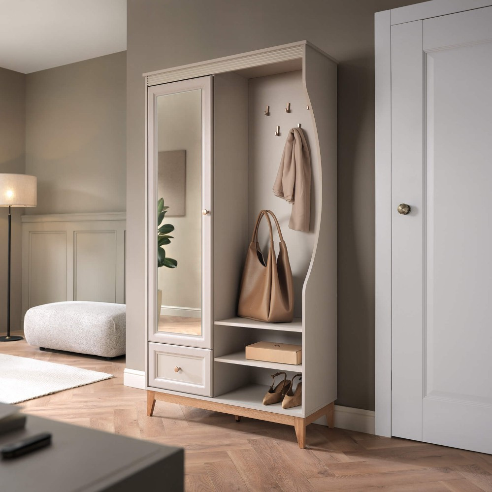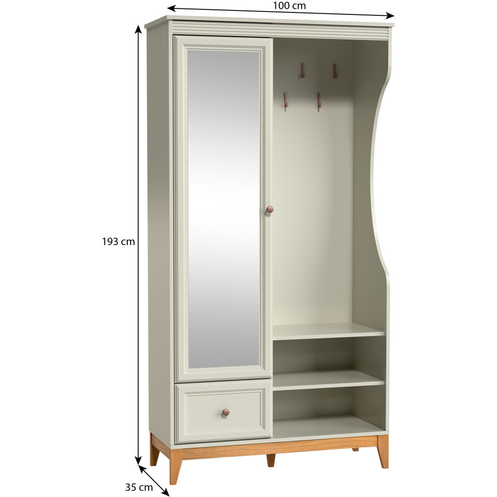 Šatní skříň CHARLOTT v kašmírové barvě je ztělesněním moderní elegance a funkčnosti. Tato šatní skříň se zrcadlem dokonale odpovídá trendům současného designu a nabízí nejen úložný prostor, ale je také funkčním kusem nábytku. Multifunkční konstrukce šatní skříně Windsor byla navržena pro maximální využití prostoru. Předsíňová šatní skříň je vybavena: Zrcadlem v plné velikosti – opticky zvětšuje místnost, Ramínky na oblečení – ideální na bundy, kabáty a obleky, Úložnými přihrádkami – na doplňky, boty a drobnosti; zásuvkami – na drobnosti a spodní prádlo; praktickými úchyty – v elegantních barvách. Nábytek v barvě kašmíru je trend, který nikdy nevyjde z módy. Tento teplý, tlumený odstín doplňuje různé styly interiérového designu – od moderních ložnic až po klasické chodby. Šatní skříň Windsor Kashmir harmonicky zapadne do jakéhokoli interiéru a dodá mu sofistikovanost. Rozměry: pl_text-expander--expanded">