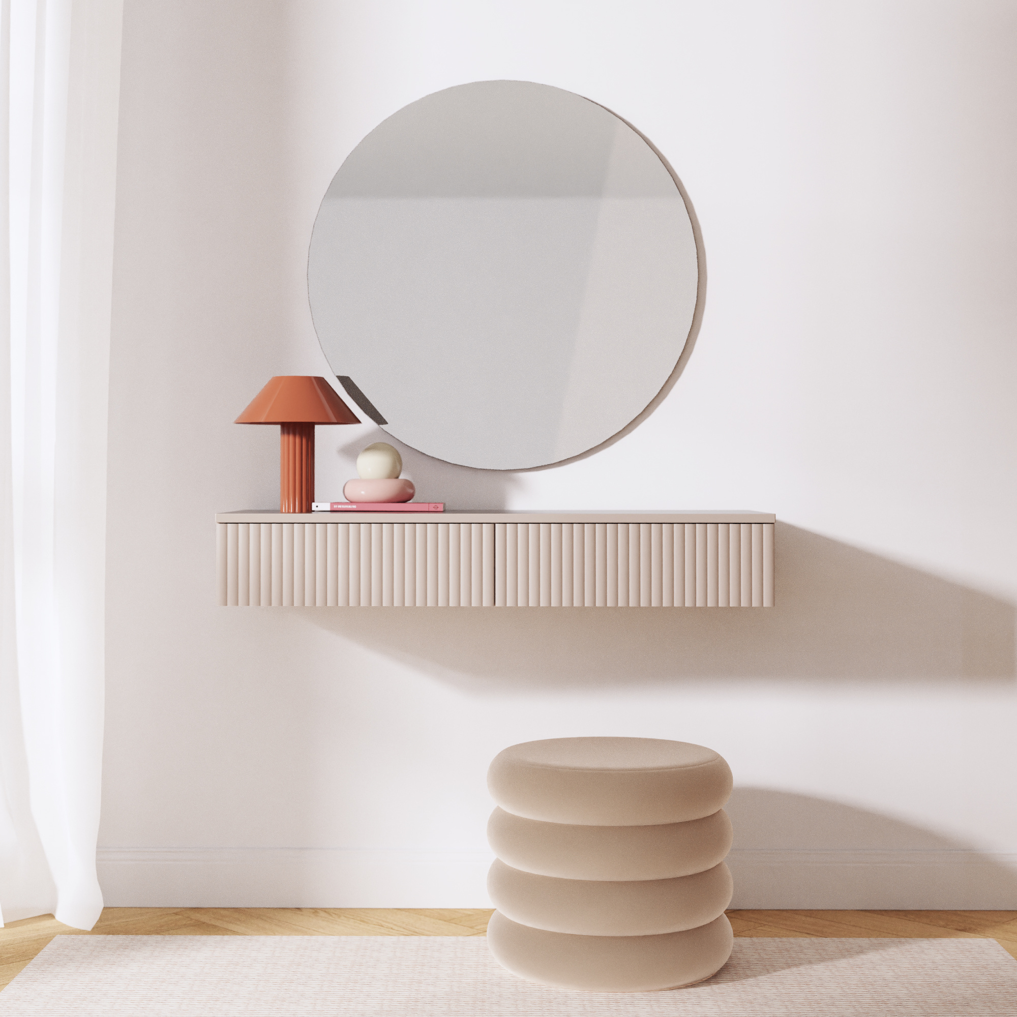 Kostru zkosení tvoří robustní 18mm dřevotříska, čela jsou vyrobena z vysoce kvalitní MDF, zatímco zadní část je vyrobena ze stabilní HDF desky deska je vyrobena. Nástěnná konstrukce zajišťuje, že podlaha zůstane volná, místnost opticky zvětší a usnadňuje čištění. Konzolový stolek s rozměry 100 × 38 × 17 cm nabízí praktický úložný prostor pro dekorace, předměty denní potřeby nebo klíče, aniž by zabíral mnoho místa. Rozměry: