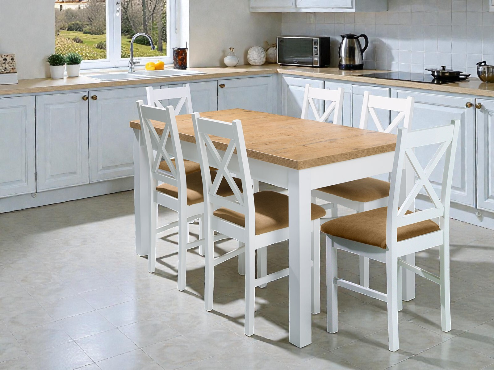 Hledáte jídelní kout, který prosvětlí váš interiér a dodá mu nádech moderní útulnosti? Tento set rozkládacího stolu a šesti židlí vsází na nadčasovou barevnou kombinaci. Kontrast čistě bílého základu a robustní pracovní desky v dekoru dub craft s výraznou kresbou dřeva vytváří harmonický celek, který se hodí do moderních i rustikálních kuchyní.
