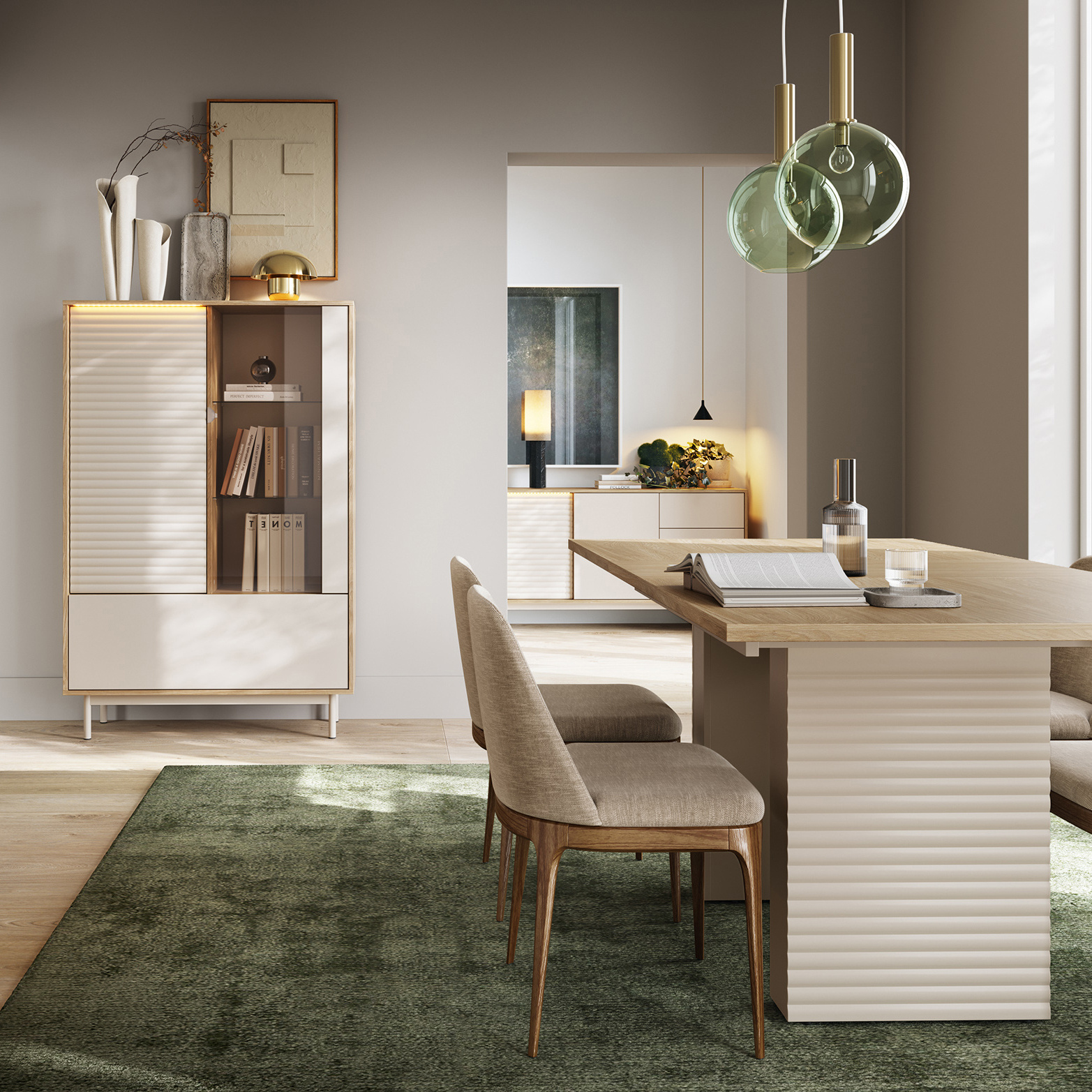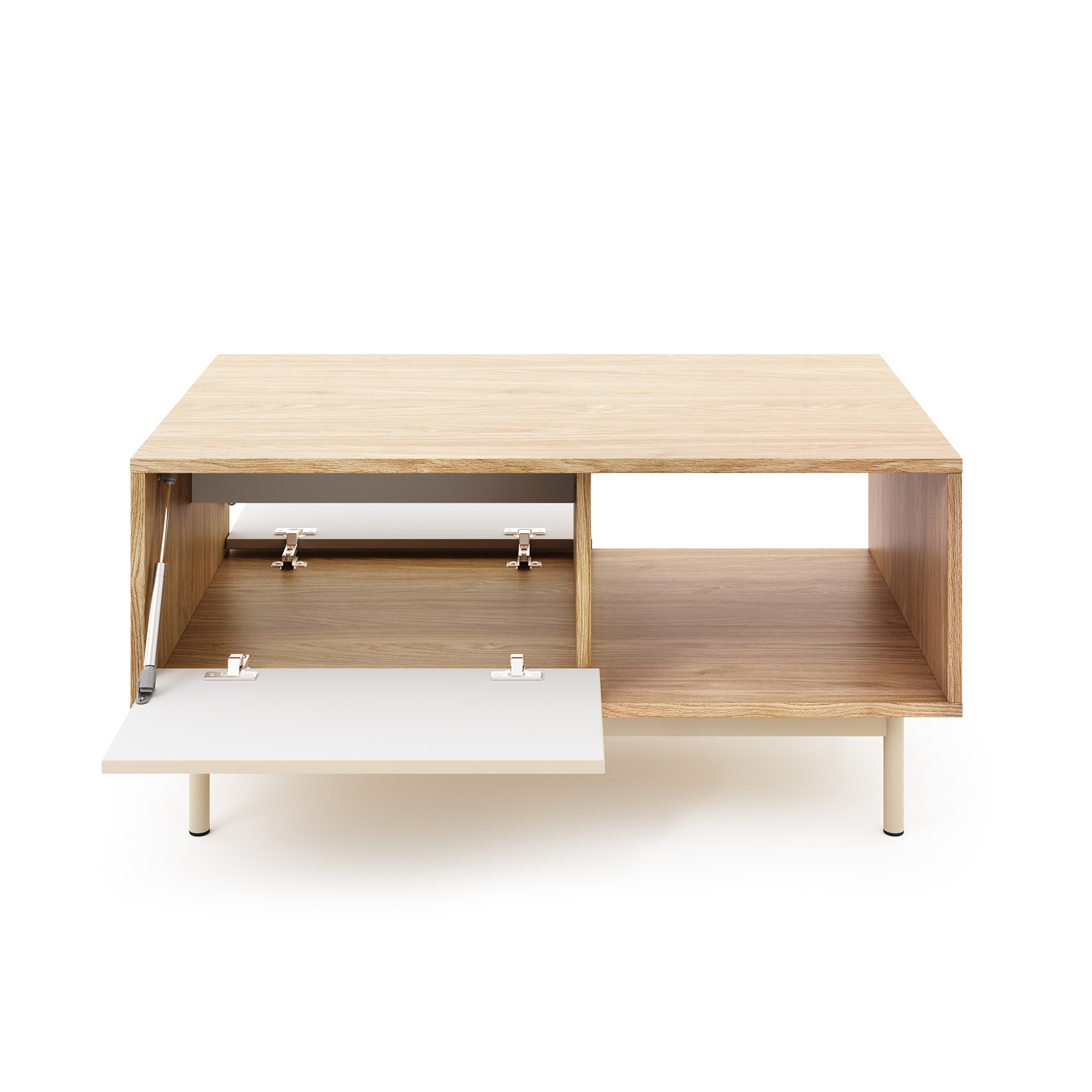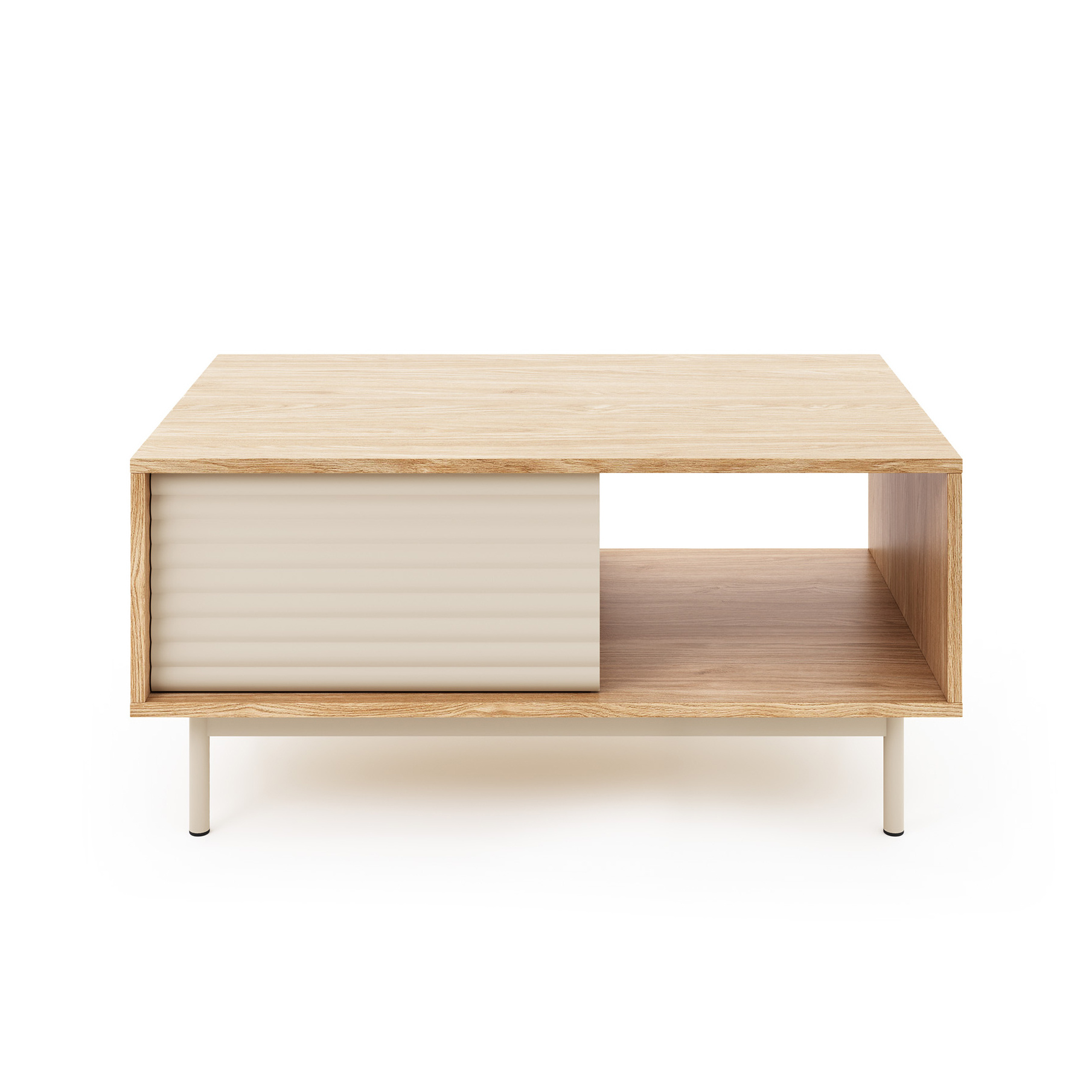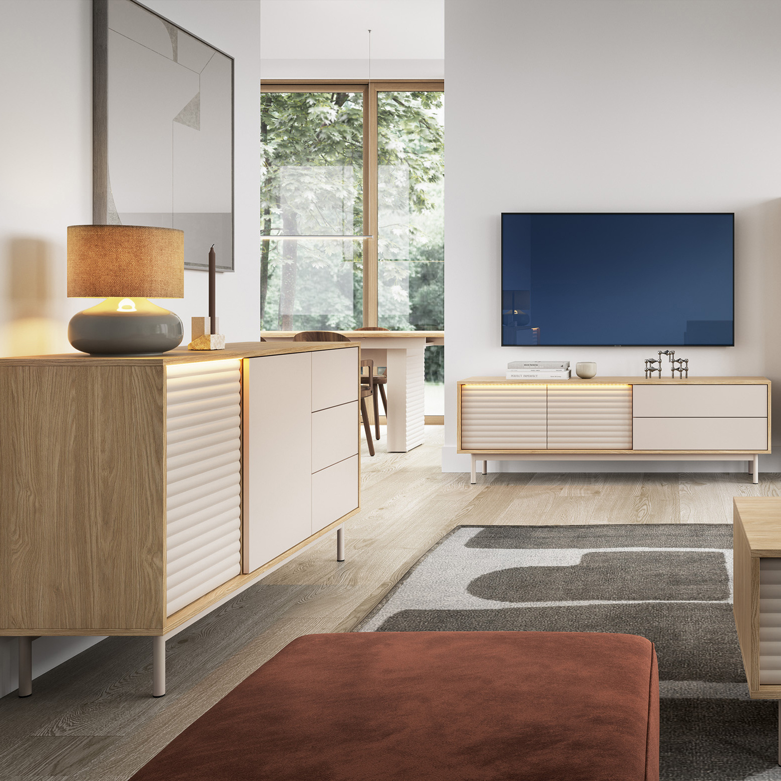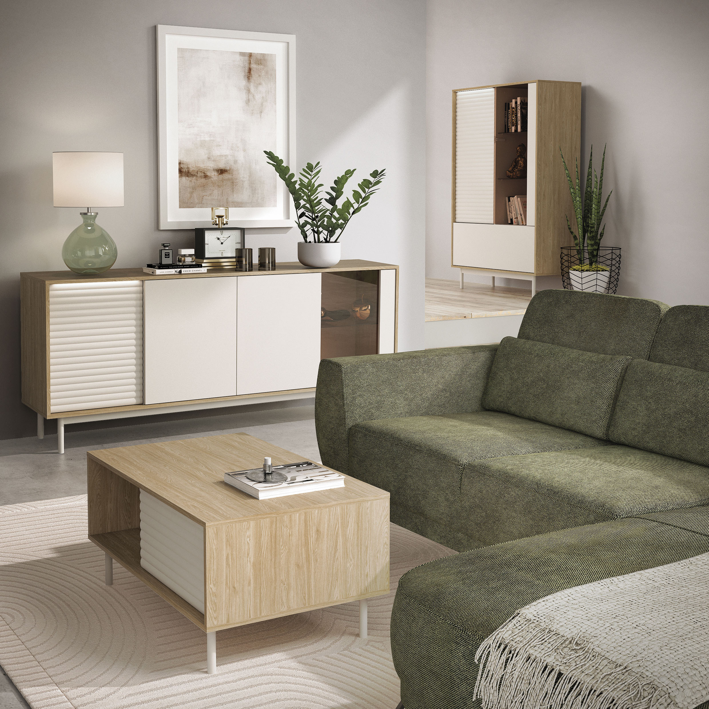 Konferenční stolek TERRA kombinuje moderní design s chytrým úložným prostorem a stává se stylovým ústředním bodem. Vašeho obývacího pokoje. Teplé barevné schéma kašmíru a olejovaného dubu dodává místnosti útulnou a zároveň elegantní atmosféru – ideální pro moderní bydlení s charakterem. Promyšlený design s praktickým úložným prostorem. Stůl má dvě klopy, které se otevírají z obou stran, což umožňuje snadný a pohodlný přístup do interiéru. Lze zde uložit dálkové ovladače, knihy nebo předměty denní potřeby, aniž by narušily čisté linie designu. Další výklenek na police nabízí prostor pro časopisy, dekorace nebo doplňky – funkční i esteticky příjemné. Vysoce kvalitní materiály a stylové detaily: Drážkované čela z MDF nejsou jen výrazným designovým akcentem, ale také vyjádřením moderního řemeslného zpracování. Pečlivé řemeslné zpracování a robustní konstrukce zaručují odolnost a stabilitu, zatímco harmonická kombinace kašmíru a dubu dodává stolu přirozený a elegantní vzhled. Nadčasová elegance pro váš obývací pokoj. Konferenční stolek TERRA je více než jen funkční kus nábytku – do vašeho obytného prostoru vnáší styl, strukturu a teplo. Ať už jako poutavý prvek před pohovkou, nebo jako harmonická součást celé kolekce TERRA, podtrhuje moderní zážitek z bydlení a zajišťuje ucelený celkový vzhled.
