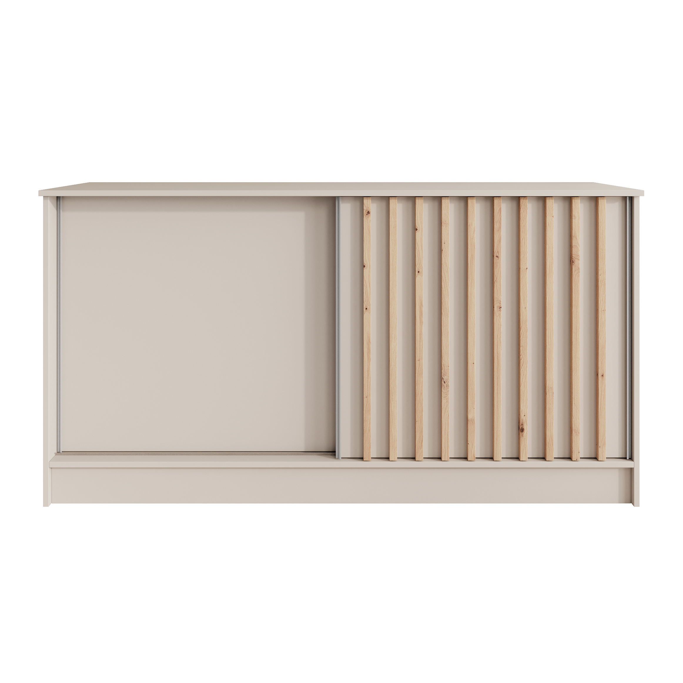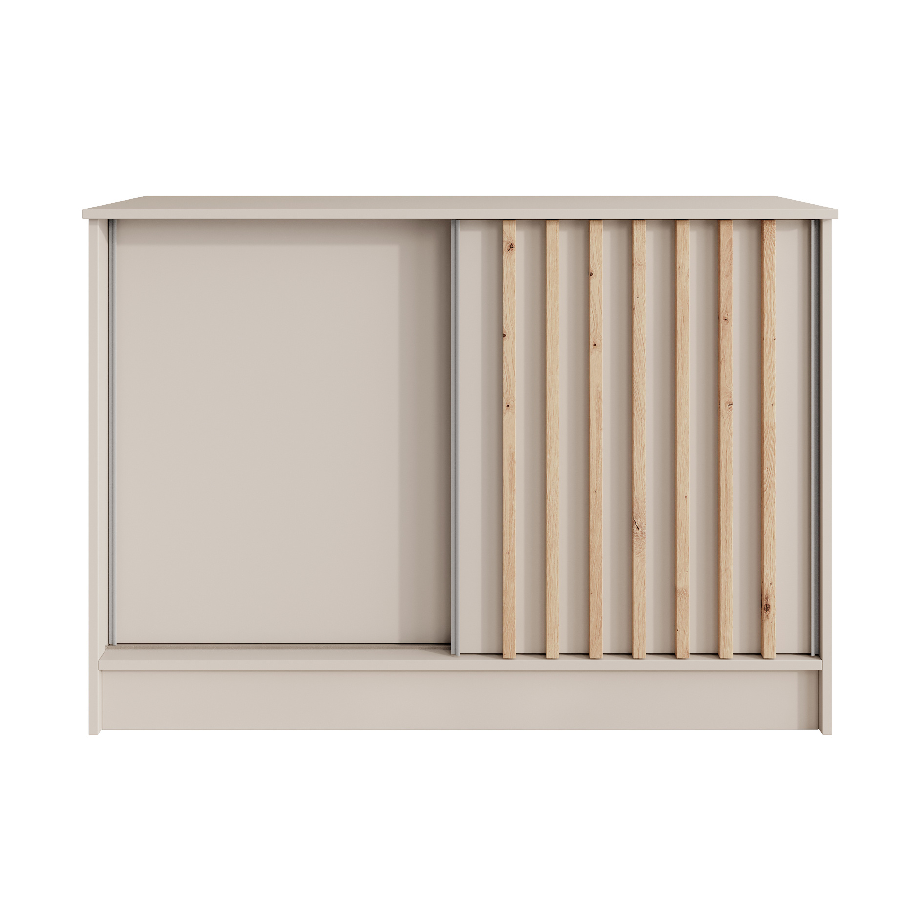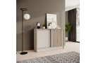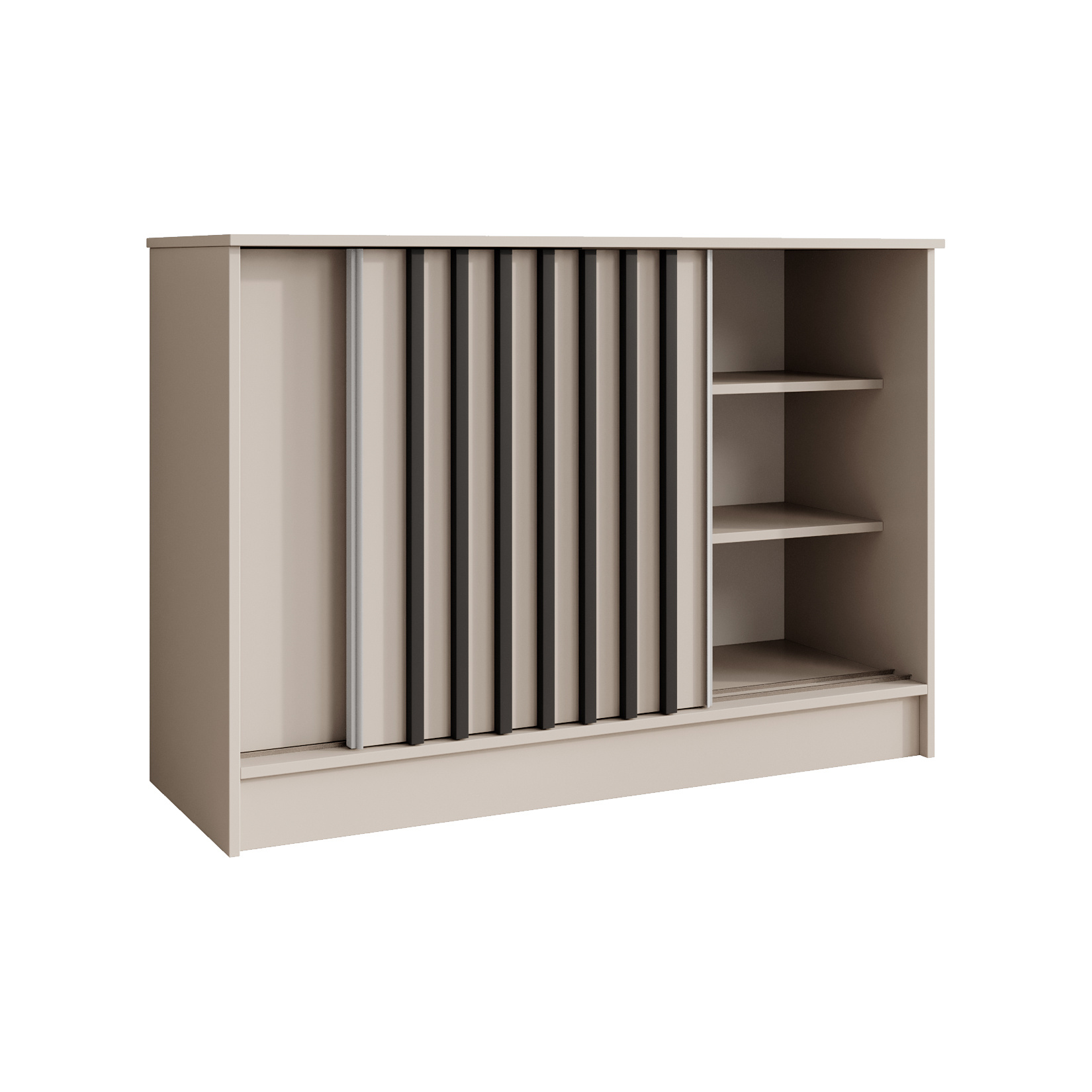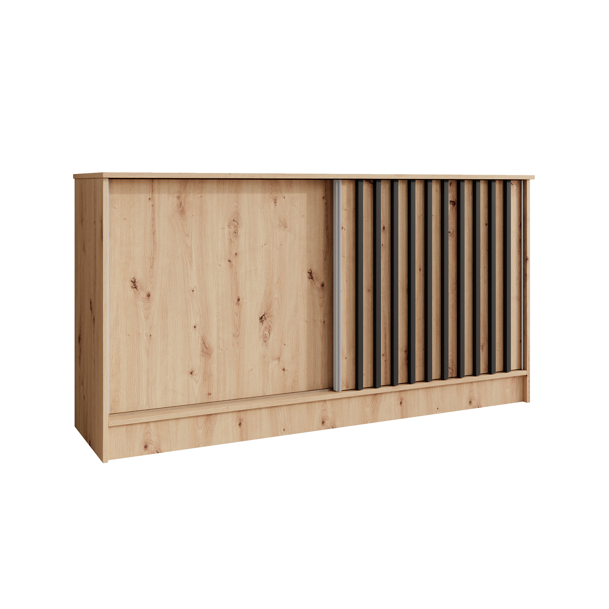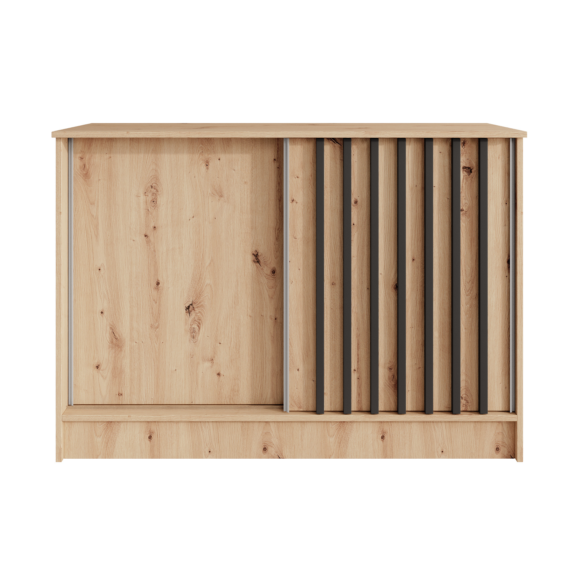 Komoda HORIZON kombinuje moderní design, funkčnost a nadčasovou eleganci. Díky dekorativním lamelovým čelům a čistým liniím se stane stylovým poutavým prvkem v každé místnosti – ať už v obývacím pokoji, ložnici nebo chodbě. Díky dvěma posuvným dvířkům nabízí komoda dostatek úložného prostoru, aniž by vyžadovala další prostor k otevírání dvířek – ideální i pro menší místnosti. Dobře navržené uspořádání umožňuje úhledné a organizované uložení oblečení, nádobí, dokumentů nebo dekorací. Komoda je k dispozici v několika moderních barevných variantách: Artisan Oak, Black, White nebo Cashmere – ideální pro harmonické začlenění do různých interiérových designových konceptů. Její elegantní vzhled lze skvěle kombinovat s nábytkem ze série