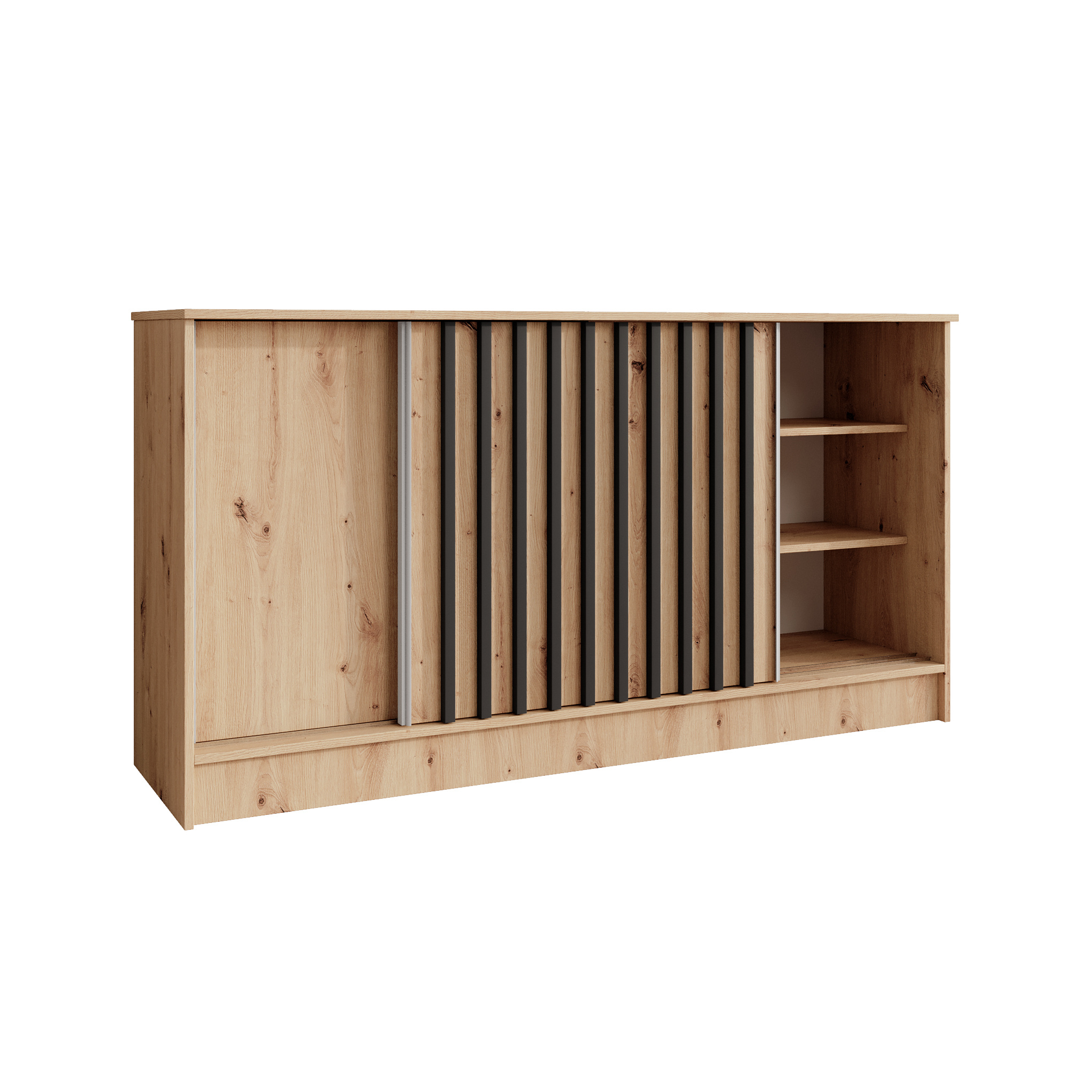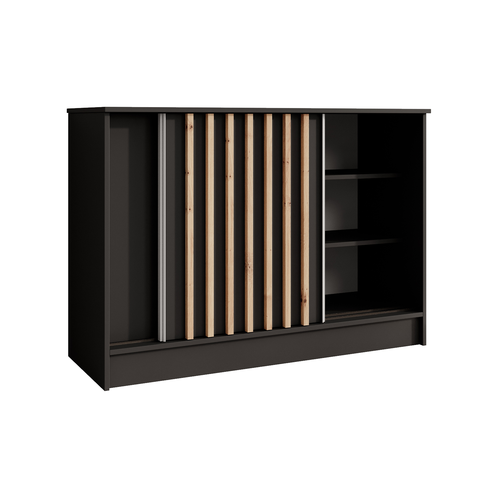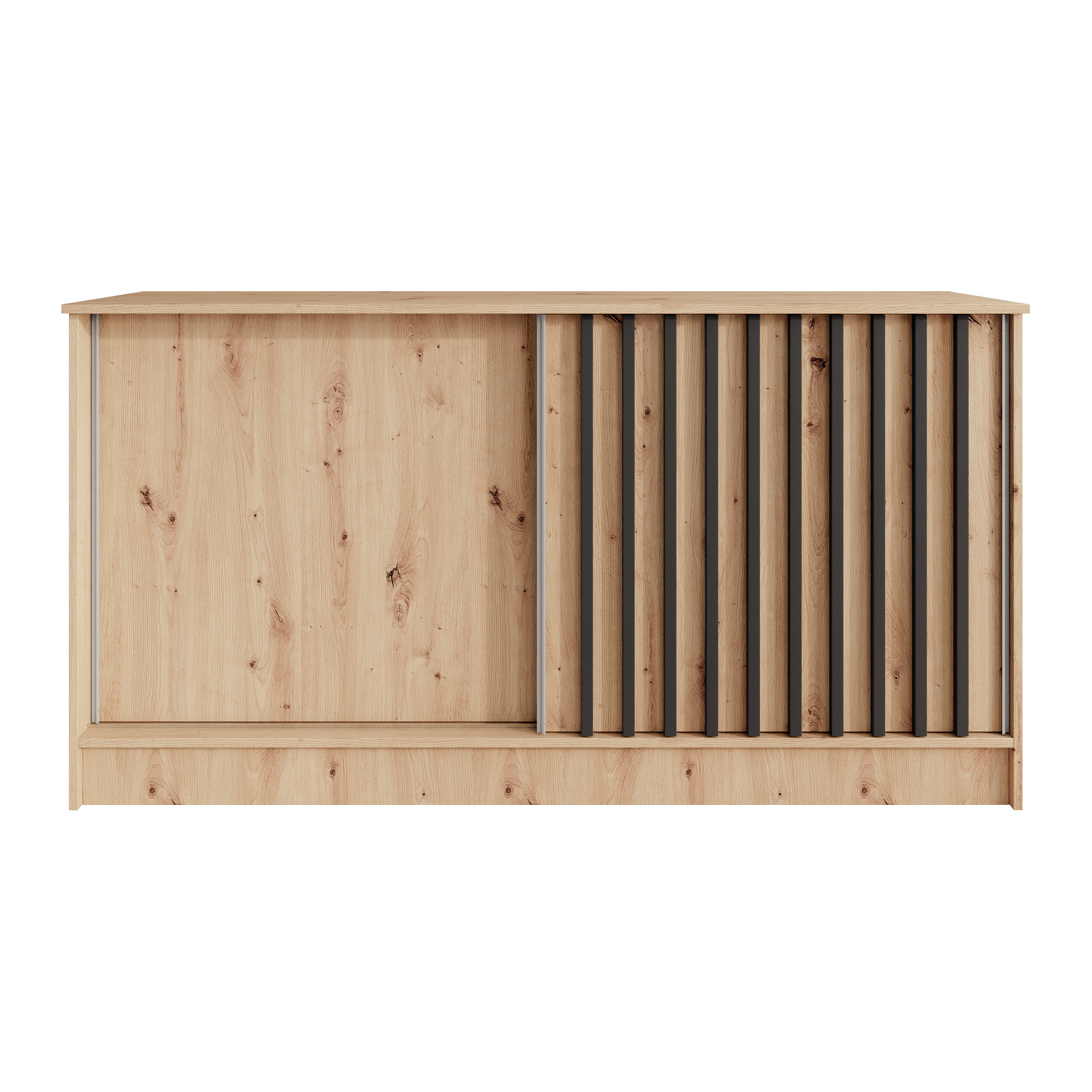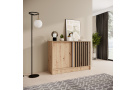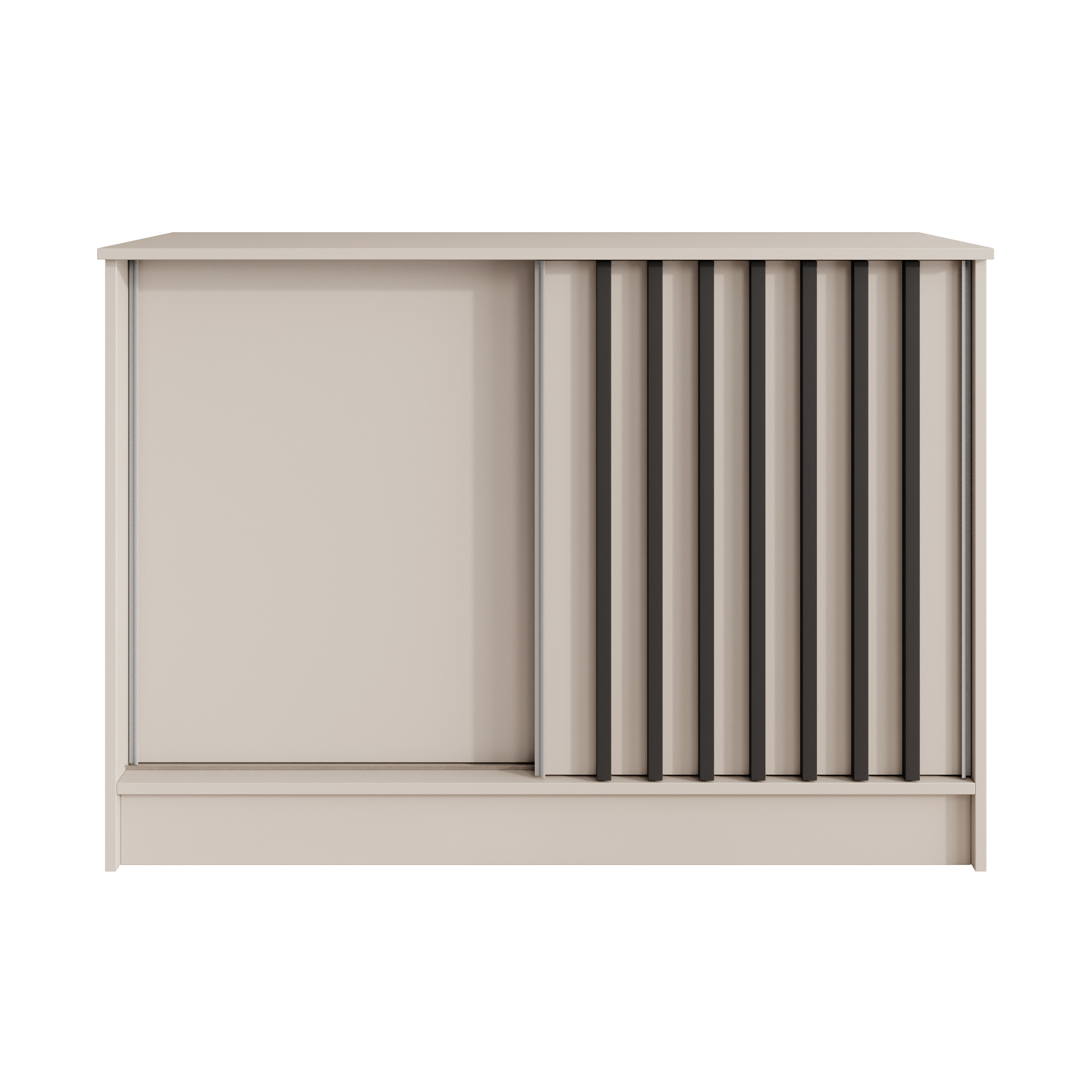 Komoda HORIZON kombinuje moderní design, funkčnost a nadčasovou eleganci. Díky dekorativním lamelovým čelům a čistým liniím se stane stylovým poutavým prvkem v každé místnosti – ať už v obývacím pokoji, ložnici nebo chodbě. Díky dvěma posuvným dvířkům nabízí komoda dostatek úložného prostoru, aniž by vyžadovala další prostor k otevírání dvířek – ideální i pro menší místnosti. Dobře navržené uspořádání umožňuje úhledné a organizované uložení oblečení, nádobí, dokumentů nebo dekorací. Komoda je k dispozici v několika moderních barevných variantách: Artisan Oak, Black, White nebo Cashmere – ideální pro harmonické začlenění do různých interiérových designových konceptů. Její elegantní vzhled lze skvěle kombinovat s nábytkem ze série