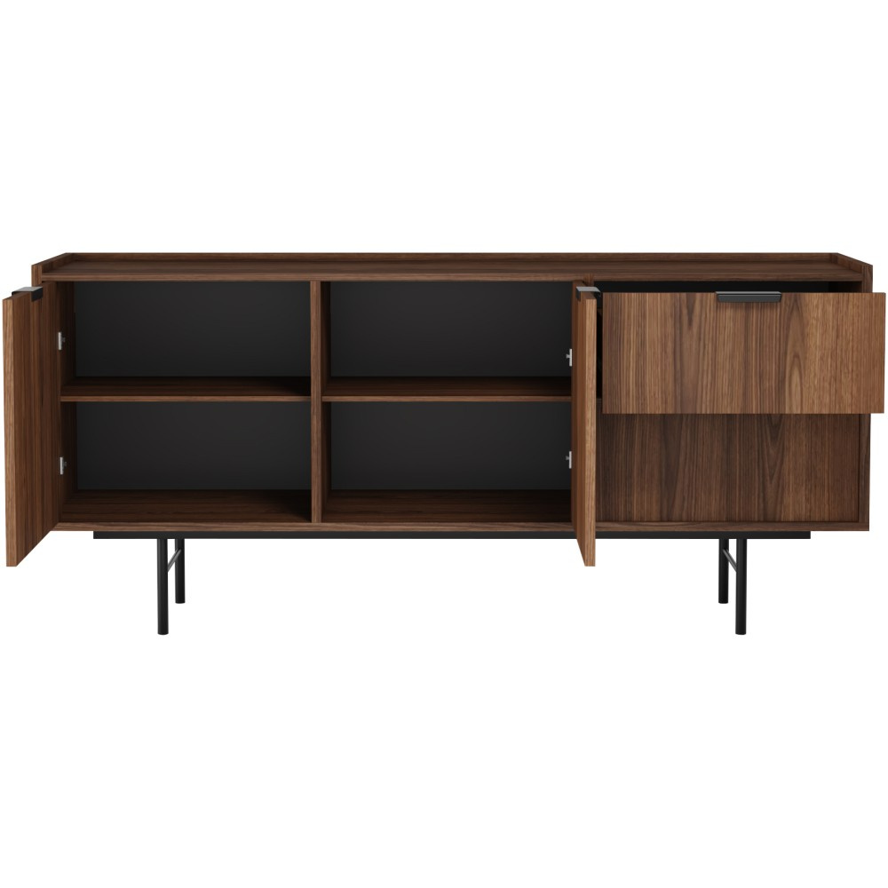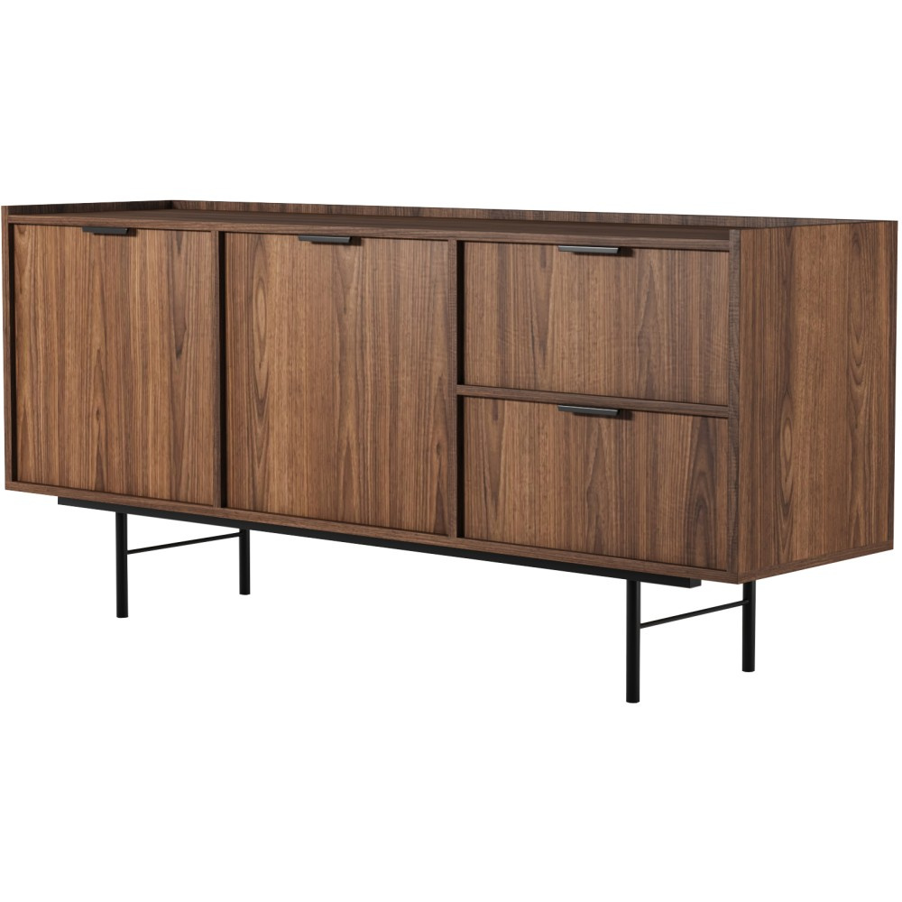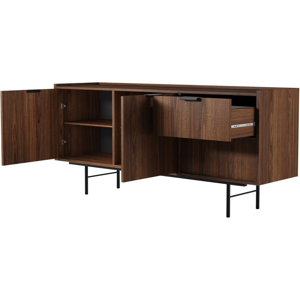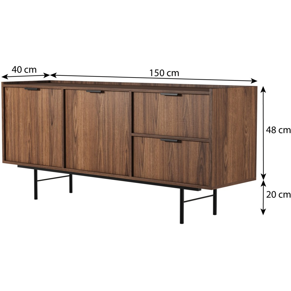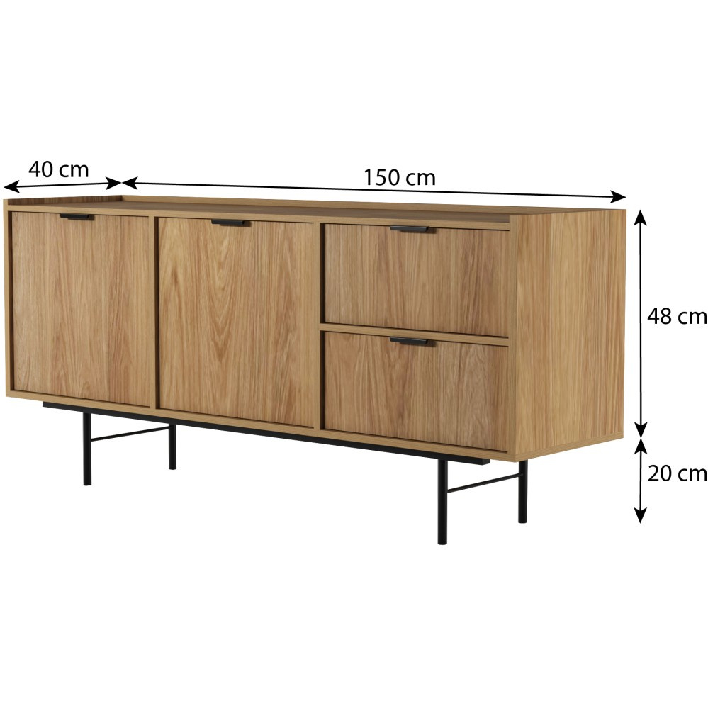 Komoda EVRON zaujme svým elegantním designem, praktickým uspořádáním a vysoce kvalitním zpracováním. Díky čistým liniím a moderním kovovým akcentům vnese styl a řád do každé místnosti – ať už se jedná o obývací pokoj, ložnici nebo jídelnu. Praktické uspořádání a dostatek úložného prostoru – komoda nabízí dvě prostorné skříňky, každá s jednou policí, ideální pro uložení nádobí, textilií nebo dokumentů. Úložný prostor je doplněn dvěma hladce se vysouvajícími zásuvkami s kuličkovými ložisky, které zajišťují jemné a tiché otevírání a zavírání – ideální pro každodenní použití. Stylové detaily a vysoce kvalitní zpracování – Elegantní kovové úchyty a robustní kovové nohy (vysoké 20 cm) dodávají komodě moderní a vzdušný vzhled. Zároveň zajišťují stabilitu a odolnost. Vysoce kvalitní zpracování činí tento kus nábytku nejen vizuálně přitažlivým, ale také obzvláště robustním a snadno se o něj pečuje. Dvě elegantní barevné varianty – Komoda EVRON, která je k dispozici v trendy barvách Walnut Brown a Natural Hikory, se dokonale hodí do různých stylů interiérového designu – od klasického po moderní. Obě verze zdůrazňují přírodní charakter nábytku a vytvářejí harmonické obytné prostředí.