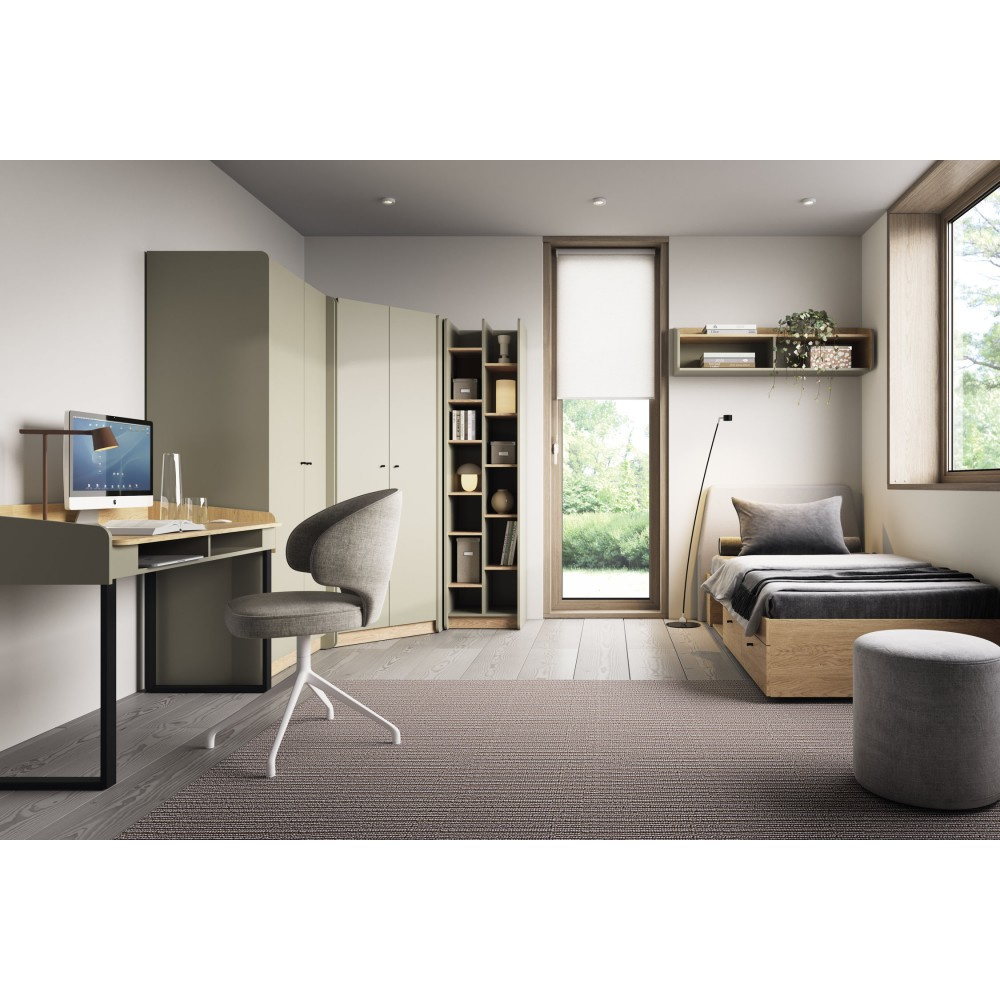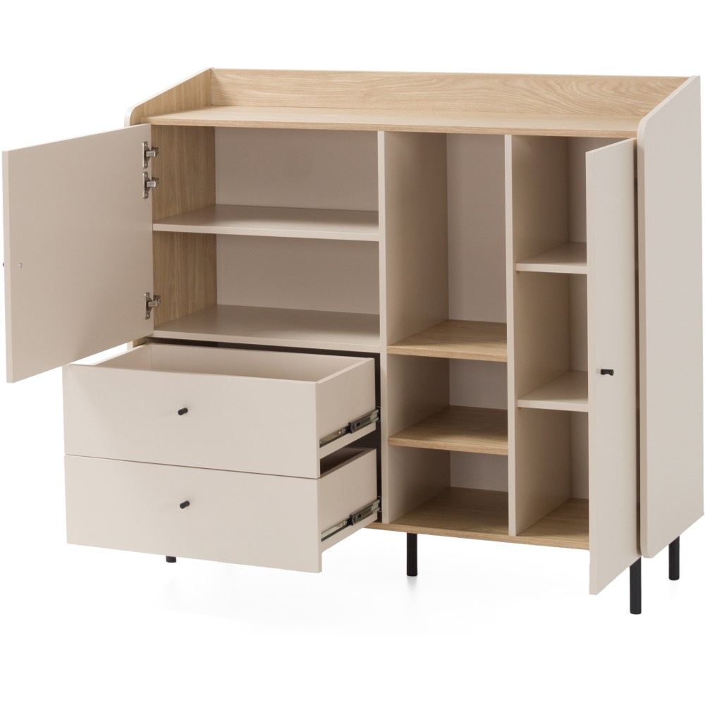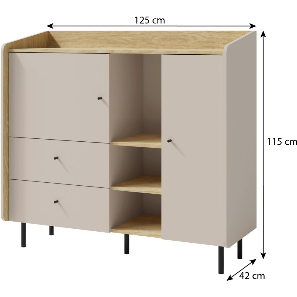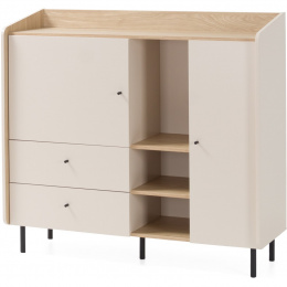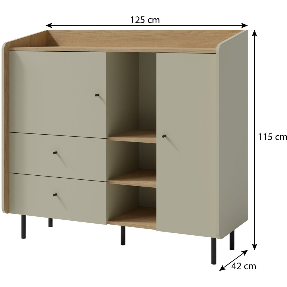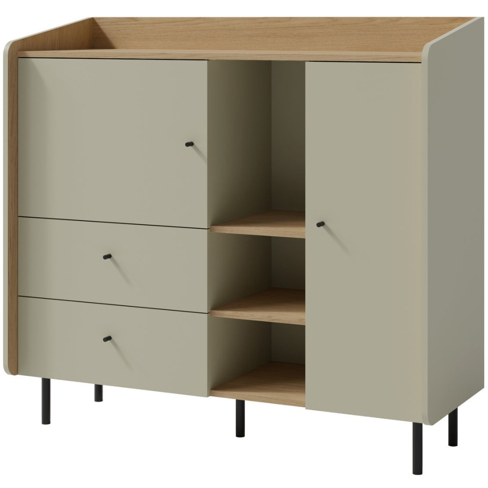 Komoda ALEX kombinuje moderní design s promyšlenou funkčností, díky čemuž je perfektním doplňkem do pokoje vašeho teenagera nebo do jakéhokoli jiného obytného prostoru, kde je potřeba větší úložný prostor a stylový vzhled. Dvoje dvířka a dvě zásuvky nabízejí uzavřený úložný prostor pro oblečení, dokumenty nebo jiné osobní věci – vše bezpečně a úhledně uložené. Osm polic zajišťuje maximální organizaci a flexibilní využití úložného prostoru. Otevřená police: Ideální pro vystavení knih, dekorací nebo osobních oblíbených předmětů. Moderní výběr barev: K dispozici v trendy barvách eukalypt a pískově béžová, které do místnosti vnášejí svěžest a eleganci. Minimalistické černé úchytky: Dodají stylový akcent a zdůrazní moderní design. Díky chytrému uspořádání zásuvek, dvířek a otevřených polic plní několik funkcí: Nabízí dostatek úložného prostoru, udržuje věci uklizené a vytváří prostor pro dekorativní doplňky. Díky moderním barvám a jednoduchým černým úchytkám se dá snadno kombinovat s různými styly interiérového designu.