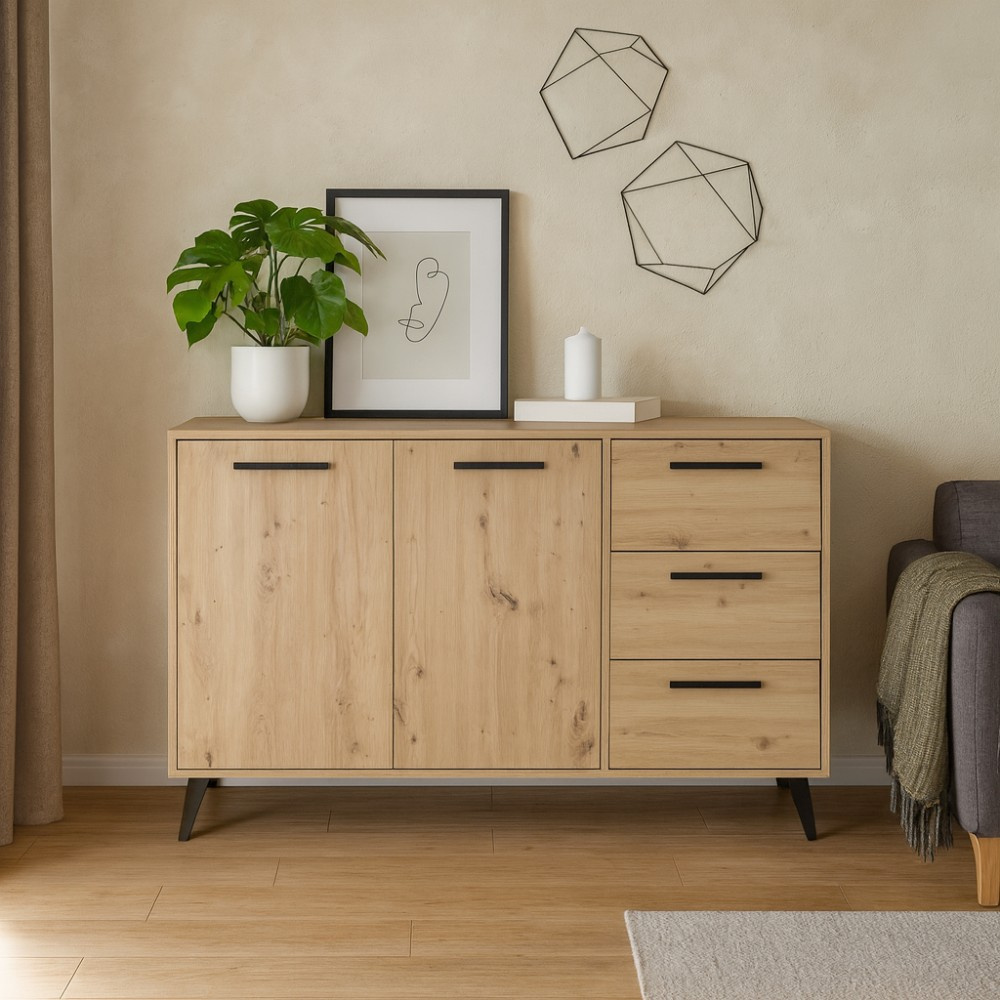 Komoda KAVO nabízí úspěšnou kombinaci úložného prostoru, moderního designu a odolných materiálů. Díky teplé povrchové úpravě z dubu sonoma a kontrastním černým úchytkám se harmonicky hodí do různých stylů interiéru – ať už se jedná o obývací pokoj, ložnici, chodbu nebo kancelář. Dvoje dvířka pro uzavřený úložný prostor – Za dvířky je dostatek prostoru pro větší předměty, jako jsou složky, nádobí nebo textilie – úhledně uložené a snadno dostupné. Tři funkční zásuvky – Zásuvky nabízejí další úložný prostor pro menší předměty, jako jsou dokumenty, doplňky nebo domácí potřeby. Ideální pro organizované úložné prostory.