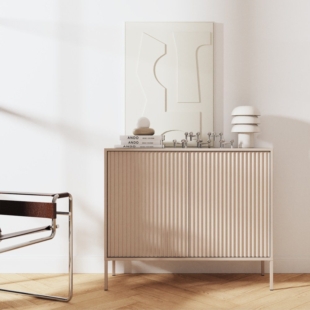 Komoda NOTO se zásuvkami s drážkovanými čely kombinuje moderní design s funkční elegancí. Jemná kašmírová barva dodá každé místnosti teplý a sofistikovaný nádech, zatímco drážkované čela dodávají komodě jedinečný charakter. Díky kompaktním rozměrům nabízí úložný prostor i stylový vzhled – ideální do obývacích pokojů, ložnic nebo chodeb.
