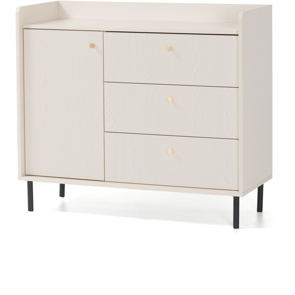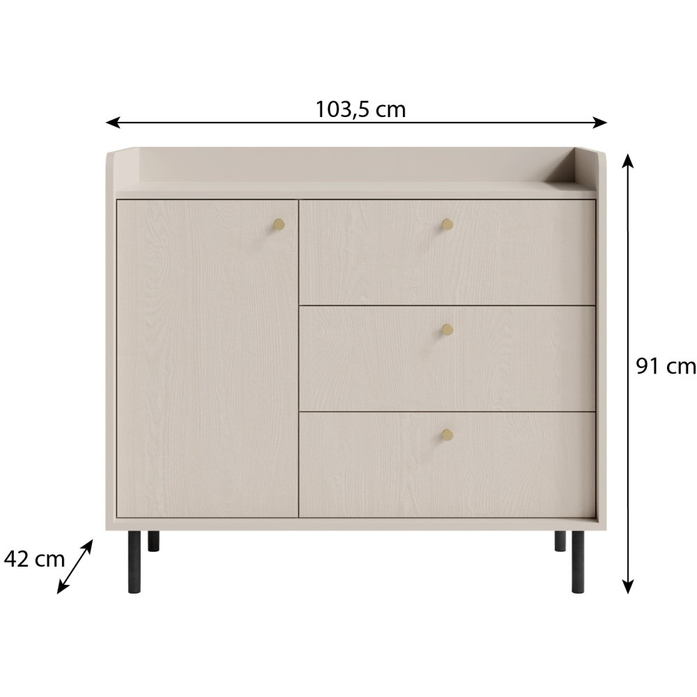 Komoda GLORIA kombinuje funkčnost a moderní design s nádechem elegance. Korpus z 16mm laminované desky zajišťuje stabilitu a odolnost, zatímco dřevěná kresba na čelních plochách dodává komodě teplý a stylový vzhled. Díky kompaktním rozměrům je ideální do obývacích pokojů, ložnic nebo pokojů pro teenagery. 3 zásuvky a 1 dvířka – nabízí všestranné možnosti uložení oblečení, doplňků nebo předmětů denní potřeby. Dekorativní design předních dveří – dřevěná kresba na čelních stěnách dodává komodě elegantní a moderní vzhled. Minimalistické zlaté úchytky – dodávají stylové akcenty a podtrhují sofistikovaný charakter. Zvýšený horní okraj – poskytuje dodatečnou stabilitu a vizuální prvek. Kovové úchytky a nožičky – robustní, odolné a dokonale sladěné s moderním designem. Komoda GLORIA se 3 zásuvkami a 1 dvířky je elegantní a funkční kus nábytku, který vytváří pořádek a zároveň dodává vašemu domovu moderní a stylový akcent. Objevte další nábytek z kolekce GLORIA v našich dalších aukcích a vytvořte si v celém domě ucelený vzhled. Rozměry: js_pdp_description">