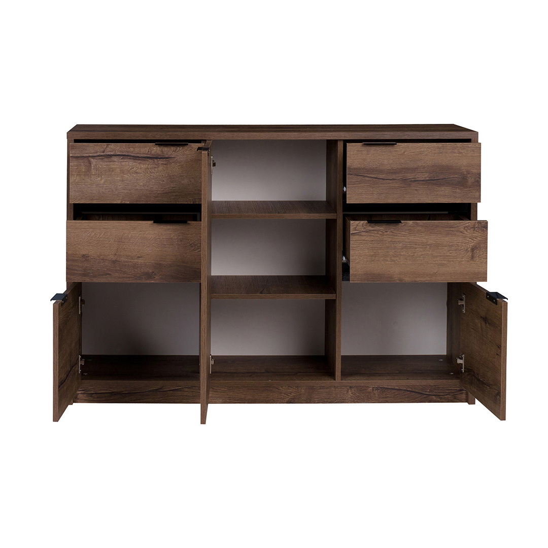 Komoda DEVON je kus nábytku, který dokonale kombinuje styl a funkčnost. Nabízí dostatek úložného prostoru pro oblečení, knihy nebo bytové doplňky, a tím zajišťuje uklizený a harmonický domov. Elegantní souhra klášterního dubu a lesklé černé dodává komodě moderní a zároveň hřejivý vzhled. Lesklé vložky dodávají elegantní akcenty, zatímco robustní kovové úchyty zajišťují snadnou a pohodlnou manipulaci. Velkorý úložný prostor: Troje dvířek a čtyři zásuvky nabízejí dostatek prostoru pro předměty denní potřeby, oblečení nebo dekorativní předměty. Elegantní vzhled: Lesklé vložky a kombinace dřeva a vysoce lesklých povrchů vytvářejí moderní a stylový vzhled. Odolná konstrukce: ABS hrany spolehlivě chrání povrchy před opotřebením. Škrábance a poškození.