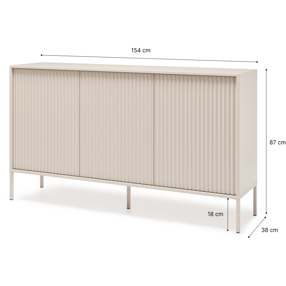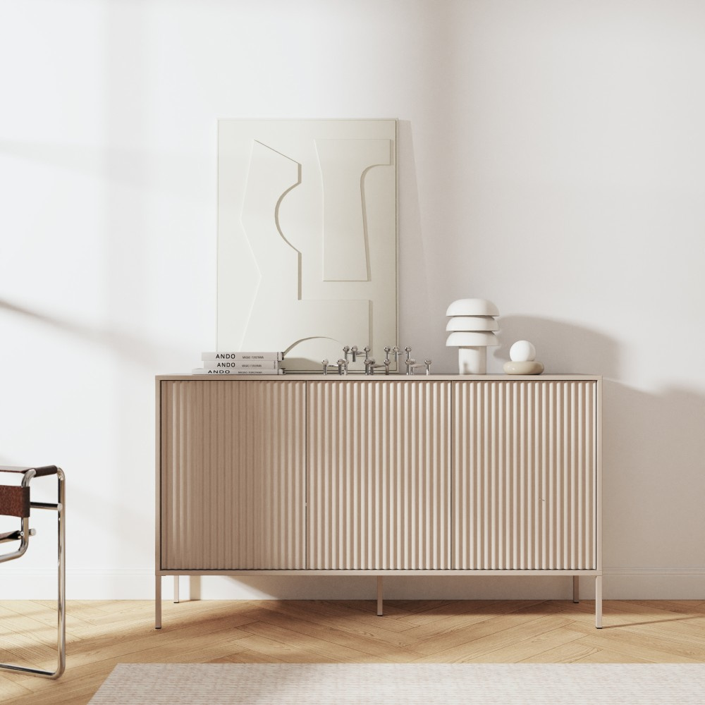 Komoda NOTO s drážkovanými čely kombinuje moderní design s funkční elegancí. Jemná kašmírová barva dodá každé místnosti teplý a sofistikovaný nádech, zatímco drážkované čela dodávají komodě jedinečný charakter. Díky kompaktním rozměrům nabízí úložný prostor i stylový vzhled – ideální do obývacích pokojů, ložnic nebo chodeb.