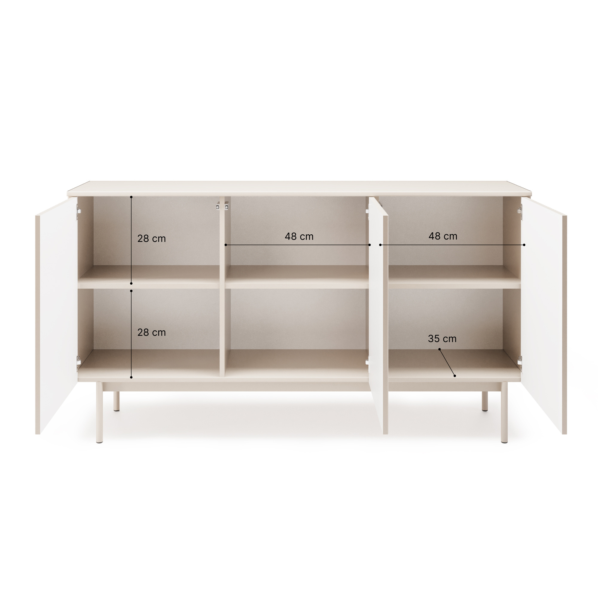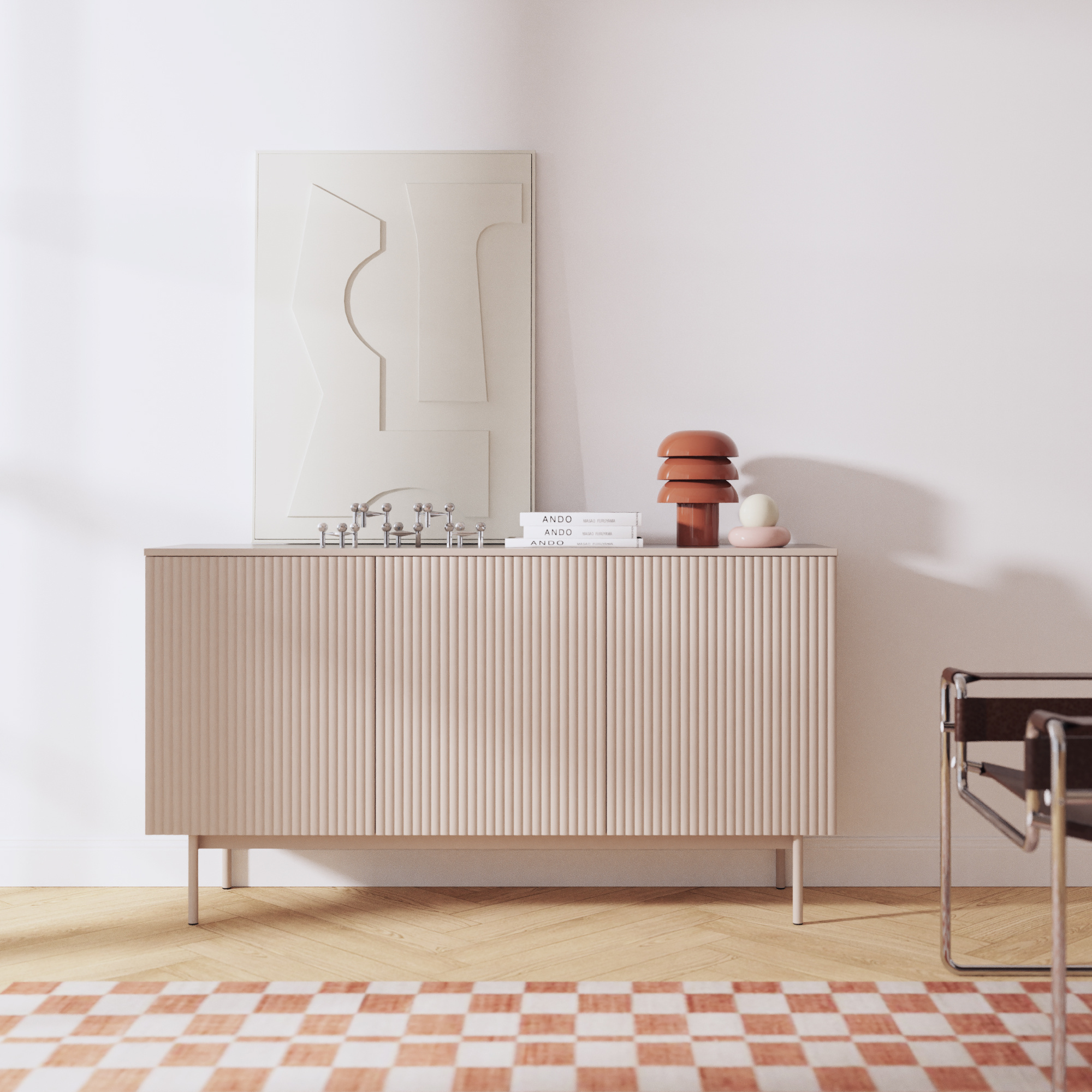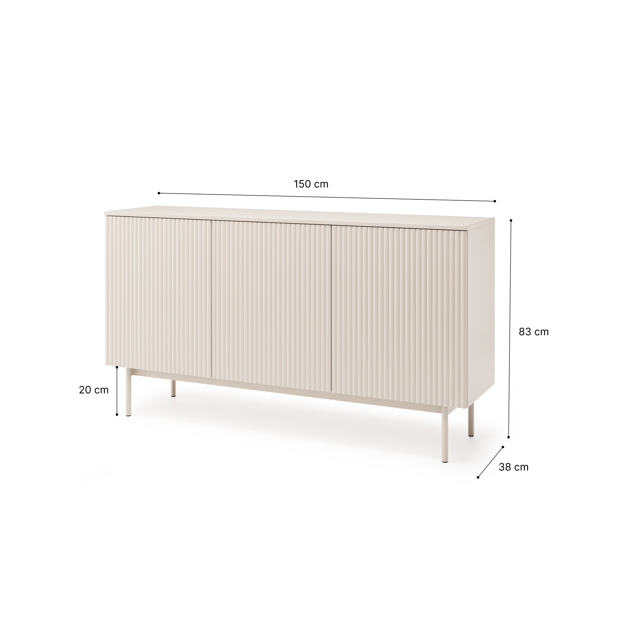 Komoda SOFT je perfektní volbou pro každého, kdo chce spojit stylový úložný prostor s moderním designem. Se svými třemi dvířky a elegantními drážkovanými čelami dodá každé místnosti osobitý nádech. Nadčasová barva kašmíru je trendy a harmonicky se hodí do různých stylů interiérového designu – od moderního po klasický. Komoda je vyrobena z vysoce kvalitních materiálů a zaujme svou stabilitou a odolností. Korpus je vyroben z robustní dřevotřísky (18 mm), čela jsou vyrobena z odolné MDF desky v kašmíru a zadní strana je vyrobena ze stabilní HDF desky. Stabilitu zajišťují elegantní kovové nohy s práškovým nástřikem, které barevně dokonale ladí s korpusem. Tato třídveřová komoda o rozměrech 150 × 38 × 83 cm nabízí dostatek úložného prostoru na nádobí, textilie, knihy nebo doplňky. Za dvířky lze věci úhledně a bez prachu uskladnit, zatímco drážkovaná čela poskytují dekorativní poutač. Ať už v obývacím pokoji, jídelně, ložnici nebo chodbě – komoda SOFT je funkční kus nábytku, který zaujme svým elegantním designem. Design, teplá kašmírová barva a velkorysý úložný prostor jsou přesvědčivé. Rozměry: Hloubka: 38 cm. Rádi bychom vás informovali, že všechny rozměry čalouněného nábytku podléhají toleranci +/- 2 %. Snažíme se zobrazit všechny barvy co nejpřesněji. Upozorňujeme však, že v důsledku nastavení monitoru a grafické karty se mohou vyskytnout drobné odchylky. Toto není důvod k reklamaci. Kromě toho se barvy různých sérií látek mohou mírně lišit v odstínu. Dodání je možné na adresy v rámci Německa. Nedodáváme na ostrovy ani do horských oblastí. Máme vlastní bezpečnou a rychlou přepravní službu. O datu dodání budete předem informováni.