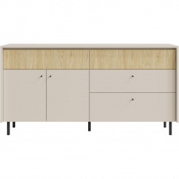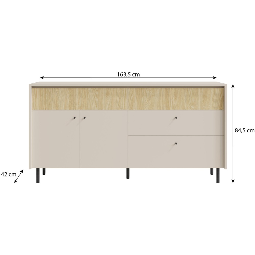 Komoda MONAKO zaujme svou zdařilou kombinací funkčnosti, moderního designu a vysoce kvalitního zpracování. S rozměry 163,5 × 42 × 84,5 cm nabízí dostatek úložného prostoru, aniž by zaplňovala místnost – ideální do obývacích pokojů, ložnic nebo pokojů pro teenagery. Čtyři prostorné zásuvky – ideální pro oblečení, doplňky nebo menší předměty denní potřeby, které by měly být vždy úhledně uložené. Harmonická barevná kombinace – moderní, decentní barevné schéma se dobře přizpůsobí různým stylům interiérového designu. Minimalistické úchytky a robustní kovové nožičky – zajišťují stylový vzhled a zároveň poskytují stabilitu a odolnost. ABS hrany – spolehlivě chrání povrchy před nárazy a poškozením, čímž prodlužují životnost komody. Komoda MONAKO se 4 zásuvkami a 2 dvířky je všestranný kus nábytku, který harmonicky kombinuje úložný prostor a moderní design. Objevte další nábytek z kolekce MONAKO v našich dalších aukcích a vytvořte si ve svém domově ucelený vzhled. Styl.