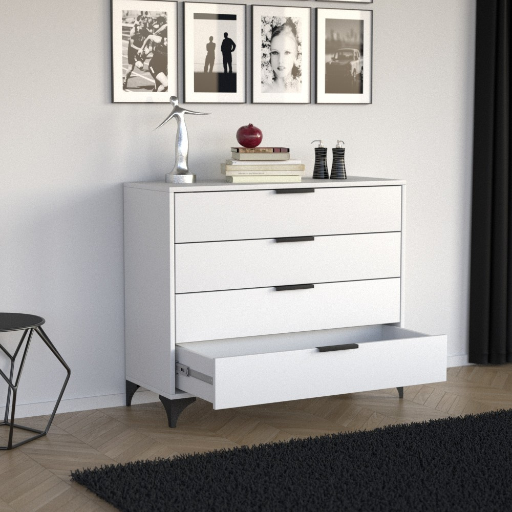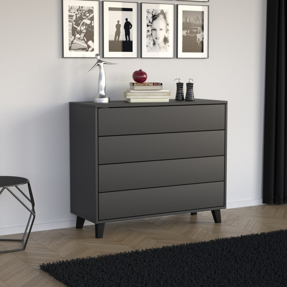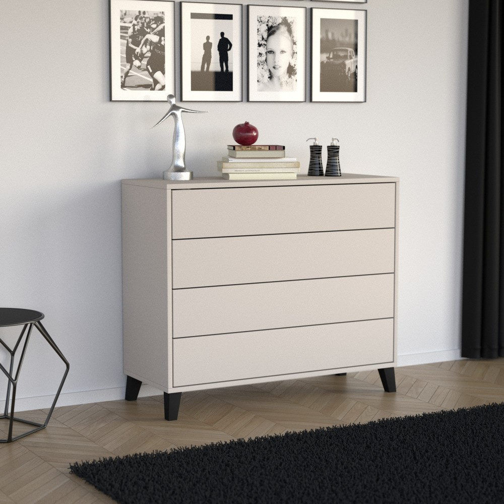 Komoda HOME se 4 zásuvkami kombinuje stylový design s praktickou funkčností a perfektně se hodí do moderních obytných prostor. Její rám je vyroben z 18 mm silné laminované desky, která zajišťuje stabilitu a dlouhou životnost. Čtyři prostorné zásuvky nabízejí dostatek úložného prostoru na oblečení, dokumenty nebo předměty denní potřeby a díky kuličkovým ložiskům se otevírají a zavírají obzvláště tiše a hladce. Pro design předních dveří jsou k dispozici dvě možnosti: buď s elegantními hliníkovými úchyty s práškovým nástřikem, které dodávají moderní nádech, nebo s minimalistickým systémem otevírání push-to-open, který zcela eliminuje potřebu úchytek. Na výběr máte také nohy: robustní kovové nebo dřevěné nohy, které vám umožní přizpůsobit komodu vašemu stylu interiéru. S šířkou 80 nebo 100 cm, výškou 85 cm a hloubkou 40 cm je komoda ideální do ložnice, obývacího pokoje nebo chodby. Díky rozmanité škále barev se harmonicky začlení do jakéhokoli interiéru a stane se stylovým a funkčním poutavým prvkem ve vaší domácnosti. Rozměry: Rozměry: Rozměry: Rozměry: Rozměry: Šířka: 80 / 100 cm Výška: 85 cm Hloubka: 40 cm Upozorňujeme, že všechny rozměry čalouněného nábytku mají toleranci +/- 2 %. Snažíme se zobrazit všechny barvy co nejpřesněji. Upozorňujeme však, že v důsledku nastavení monitoru a grafické karty se mohou vyskytnout drobné odchylky. Toto není důvod k reklamaci. Barvy různých sérií látek se navíc mohou mírně lišit v odstínu. Dodání je možné na adresy v Německu. Nedodáváme na ostrovy ani do horských oblastí. Disponujeme vlastní bezpečnou a rychlou přepravní službou. O datu dodání budete předem informováni.