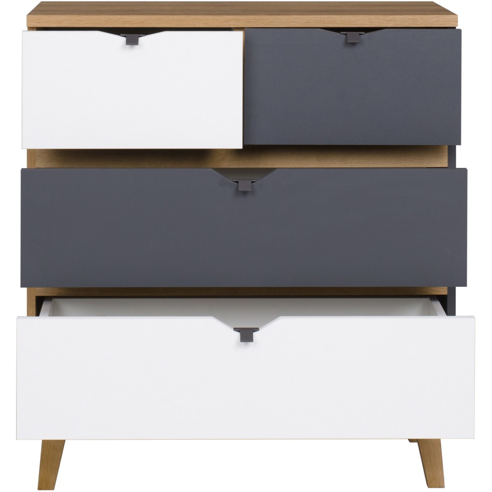 Komoda MORENO se 4 zásuvkami kombinuje funkčnost s moderním designem a zajišťuje pořádek a styl v každodenním životě – ať už v pokoji teenagera, ložnici nebo chodbě.