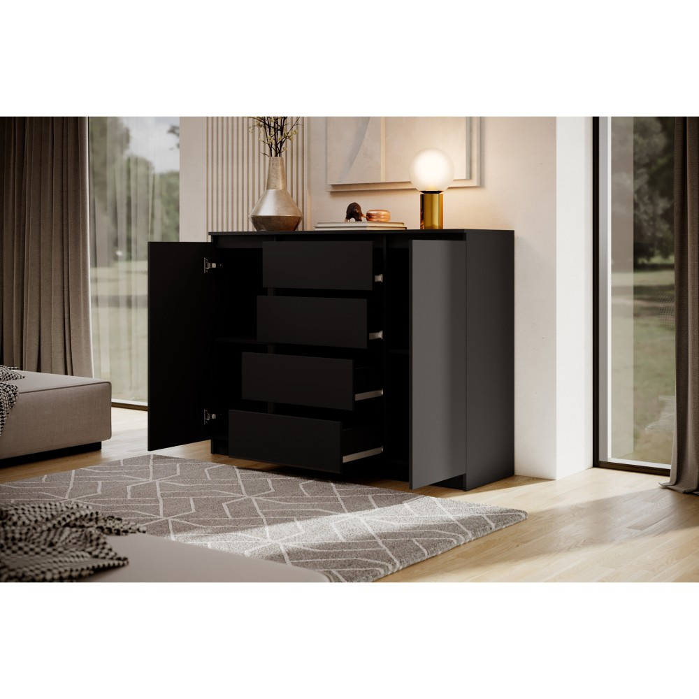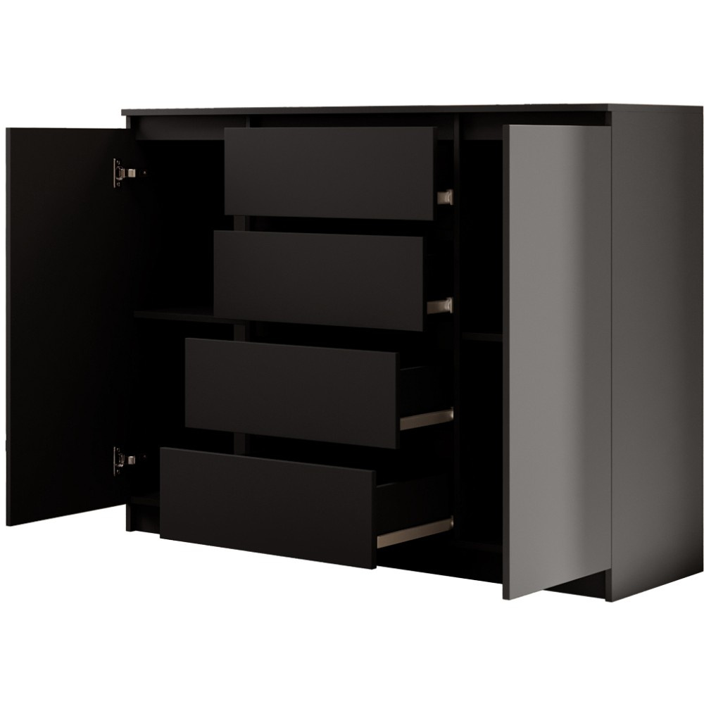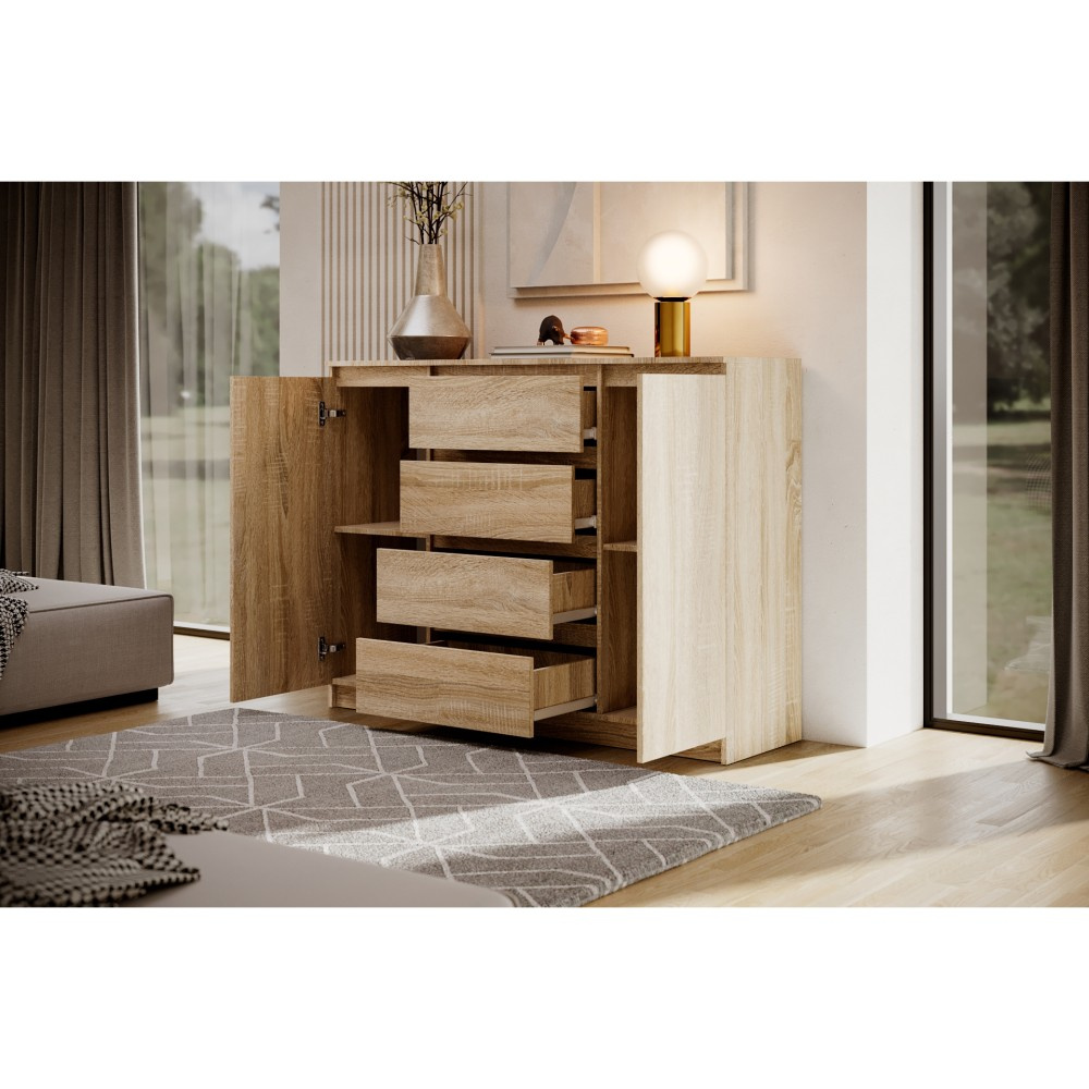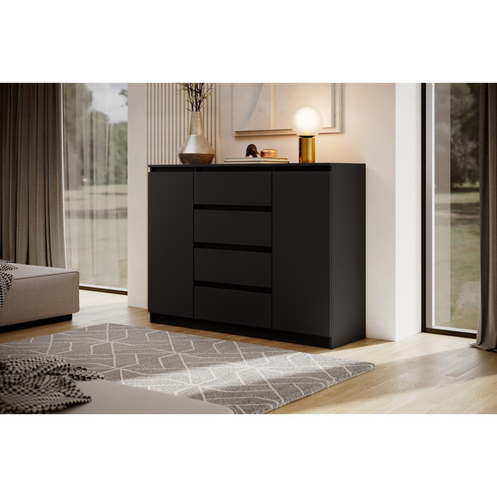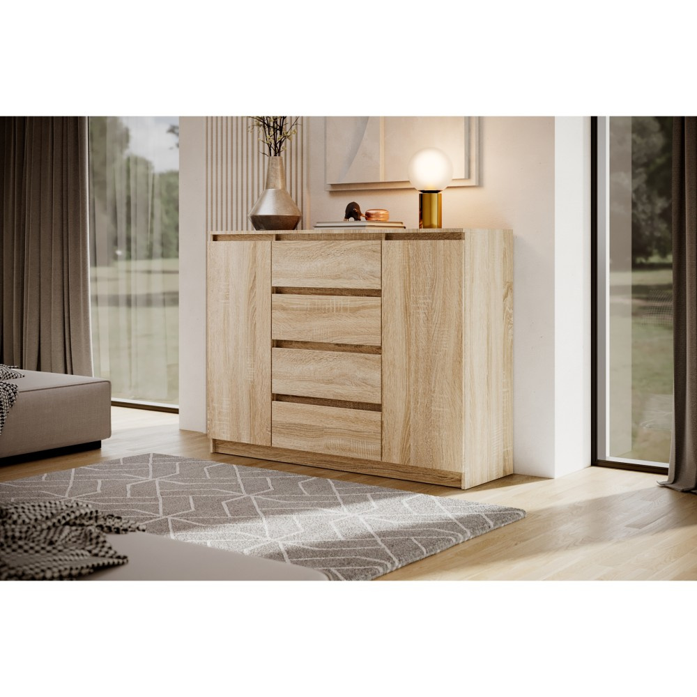Komoda LINDA se 4 zásuvkami a 2 dvířky zaujme svým moderním, nadčasovým designem a zároveň nabízí velkorysý úložný prostor pro různé obytné prostory. Ať už v ložnici, obývacím pokoji nebo chodbě – harmonicky se začlení do každého interiéru a poskytne stylovou organizaci. Promyšlené uspořádání pro více úložného prostoru – Se čtyřmi prostornými zásuvkami a dvěma uzavřenými dvířky nabízí komoda dostatek prostoru pro oblečení, textilie, dokumenty nebo další předměty denní potřeby. Přehledné uspořádání umožňuje snadnou organizaci a rychlý přístup ke všemu, co potřebujete. Moderní barevné možnosti a výběr velikostí – Komoda je k dispozici ve dvou šířkách – 120 nebo 140 cm – a lze ji proto flexibilně přizpůsobit velikosti místnosti. Vyberte si ze tří elegantních barevných variant: bílá, černá nebo dub sonoma. Bílá a černá verze jsou k dispozici také s vysoce lesklou povrchovou úpravou čel, což komodě dodává obzvláště elegantní charakter. Dokonale kombinovatelná – Série LINDA zahrnuje další kusy nábytku ve stejném stylu – ideální pro vytvoření harmonického celkového vzhledu vašeho domova. Díky čistému designu a vysoce kvalitnímu zpracování je komoda LINDA odolným a elegantním řešením pro moderní komfort bydlení. Rozměry: Šířka: 120 / 140 cm Výška: 101,5 cm Hloubka: 39 cm Rádi bychom vás informovali, že všechny rozměry čalouněného nábytku mají toleranci +/- 2 %. Snažíme se zobrazit všechny barvy co nejpřesněji. Upozorňujeme však, že se mohou mírně lišit v důsledku nastavení monitoru a grafické karty. Toto není důvod k reklamaci. Barvy různých sérií látek se navíc mohou mírně lišit. Dodání je možné na adresy v rámci Německa. Nedodáváme na ostrovy ani do horských oblastí. Disponujeme vlastní bezpečnou a rychlou přepravní službou. O datu dodání budete předem informováni.