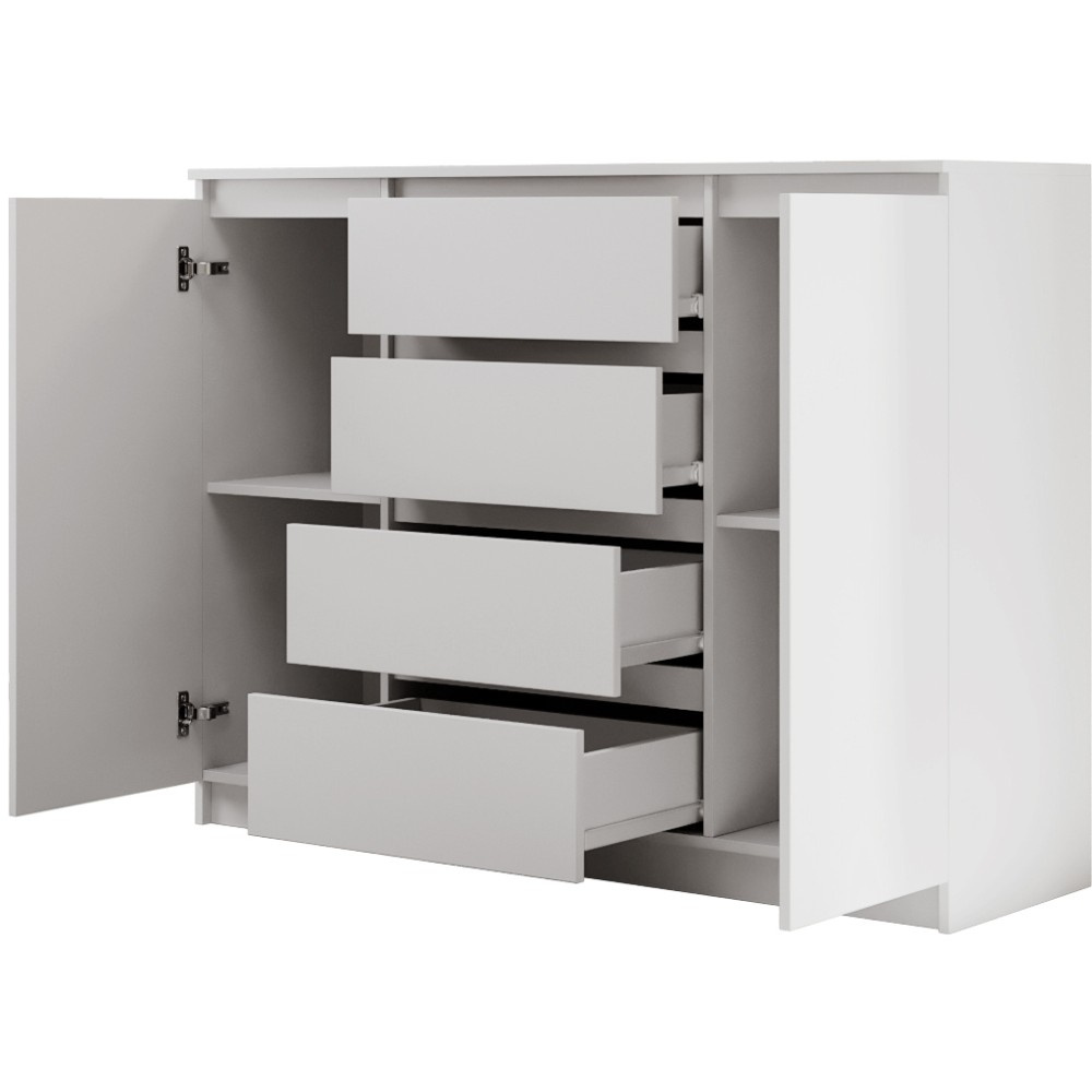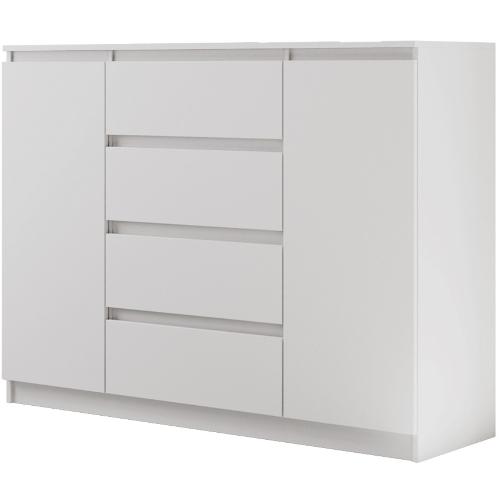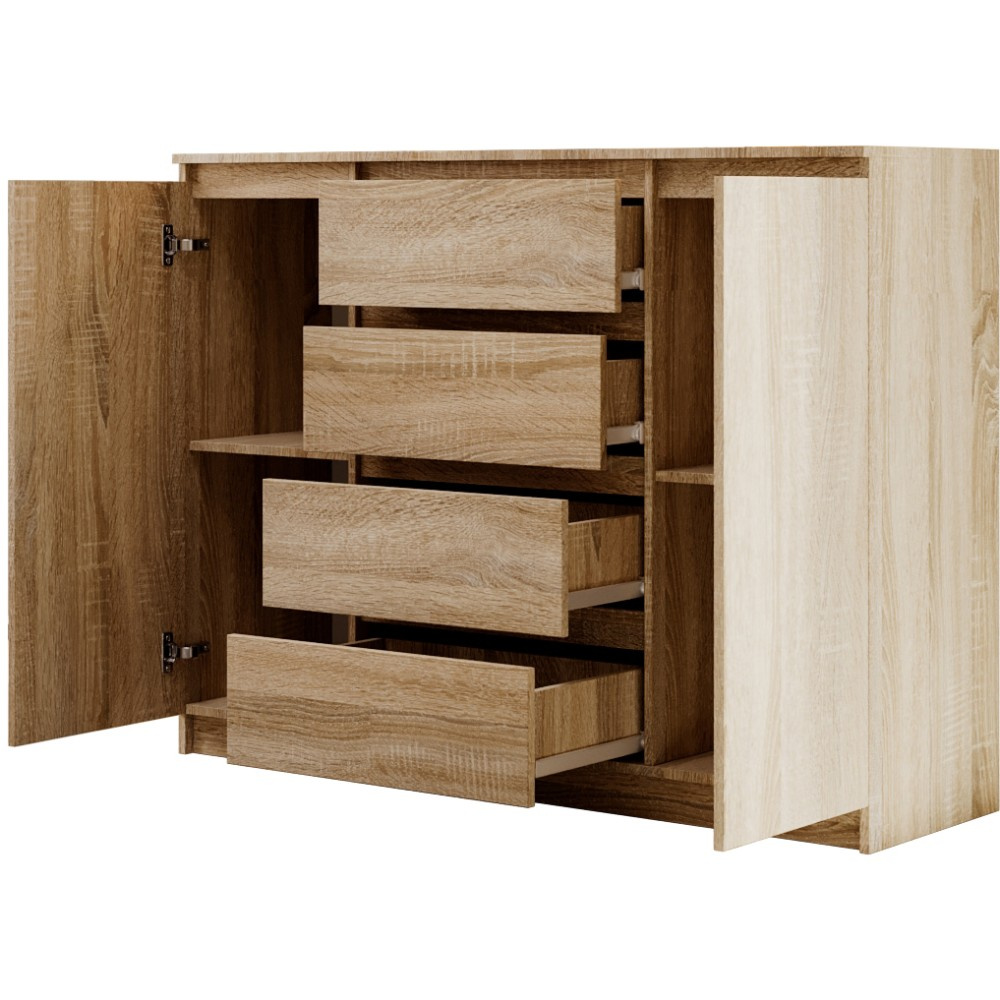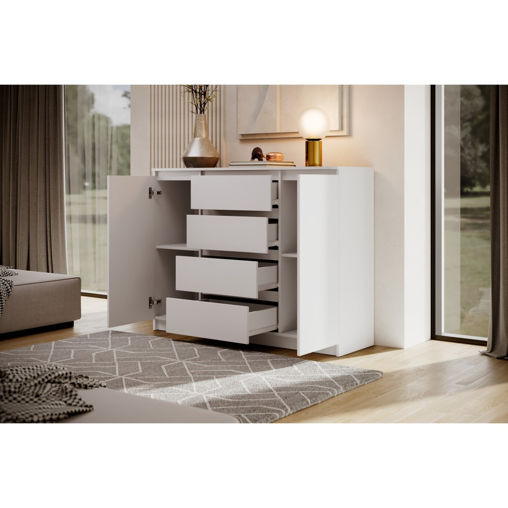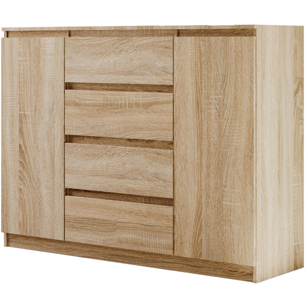 Komoda LINDA se 4 zásuvkami a 2 dvířky zaujme svým moderním, nadčasovým designem a zároveň nabízí velkorysý úložný prostor pro různé obytné prostory. Ať už v ložnici, obývacím pokoji nebo chodbě – harmonicky se začlení do každého interiéru a poskytne stylovou organizaci. Promyšlené uspořádání pro více úložného prostoru – Se čtyřmi prostornými zásuvkami a dvěma uzavřenými dvířky nabízí komoda dostatek prostoru pro oblečení, textilie, dokumenty nebo další předměty denní potřeby. Přehledné uspořádání umožňuje snadnou organizaci a rychlý přístup ke všemu, co potřebujete. Moderní barevné možnosti a výběr velikostí – Komoda je k dispozici ve dvou šířkách – 120 nebo 140 cm – a lze ji proto flexibilně přizpůsobit velikosti místnosti. Vyberte si ze tří elegantních barevných variant: bílá, černá nebo dub sonoma. Bílá a černá verze jsou k dispozici také s vysoce lesklou povrchovou úpravou čel, což komodě dodává obzvláště elegantní charakter. Dokonale kombinovatelná – Série LINDA zahrnuje další kusy nábytku ve stejném stylu – ideální pro vytvoření harmonického celkového vzhledu vašeho domova. Díky čistému designu a vysoce kvalitnímu zpracování je komoda LINDA odolným a elegantním řešením pro moderní komfort bydlení. Rozměry: Šířka: 120 / 140 cm Výška: 101,5 cm Hloubka: 39 cm Rádi bychom vás informovali, že všechny rozměry čalouněného nábytku mají toleranci +/- 2 %. Snažíme se zobrazit všechny barvy co nejpřesněji. Upozorňujeme však, že se mohou mírně lišit v důsledku nastavení monitoru a grafické karty. Toto není důvod k reklamaci. Barvy různých sérií látek se navíc mohou mírně lišit. Dodání je možné na adresy v rámci Německa. Nedodáváme na ostrovy ani do horských oblastí. Disponujeme vlastní bezpečnou a rychlou přepravní službou. O datu dodání budete předem informováni.