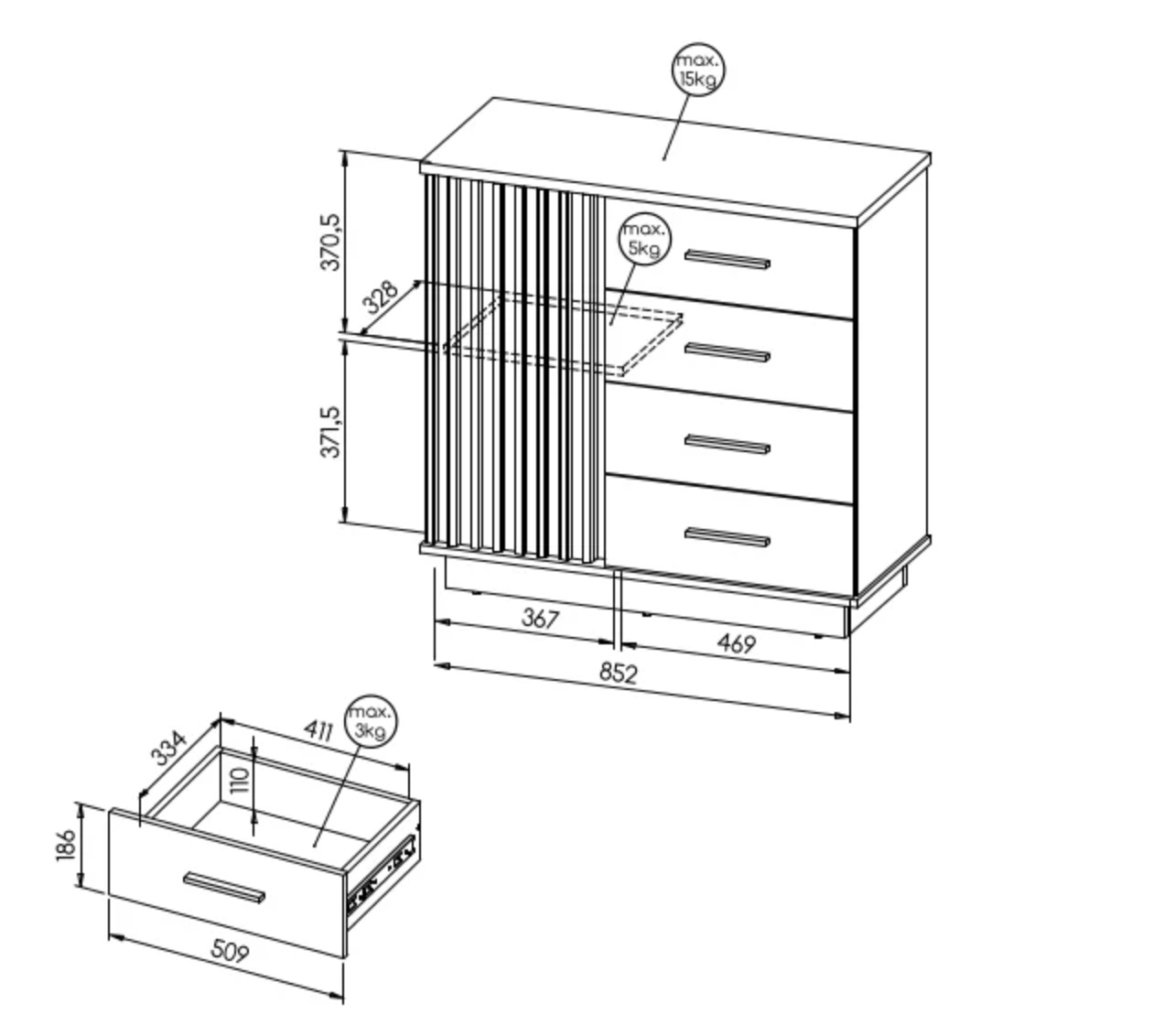- Ozdobné detaily: Vertikální lamely, které vytvářejí hru stínů a dodávají nábytku hloubku.