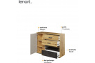 Moderní komoda se třemi zásuvkami na prádlo a skříňkou s dveřmi. Další, snadno přístupná nika je dobrým místem pro šperky a školní potřeby. Komoda se vyznačuje svým zajímavým designem - geometrický tvar, pod korpusy skryté čelní plochy a tři barvy - šedá, dřevěné dekory a surová ocel - vytvářejí jedinečnou kubistickou mozaiku. Moderní charakter nábytku je ještě více zdůrazněn elegantními kovovými úchyty a nízkými podpěrami. Nábytek je vyroben z odolné laminované desky a opatřen odolnou ABS hranou.