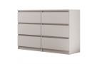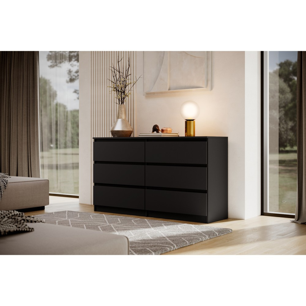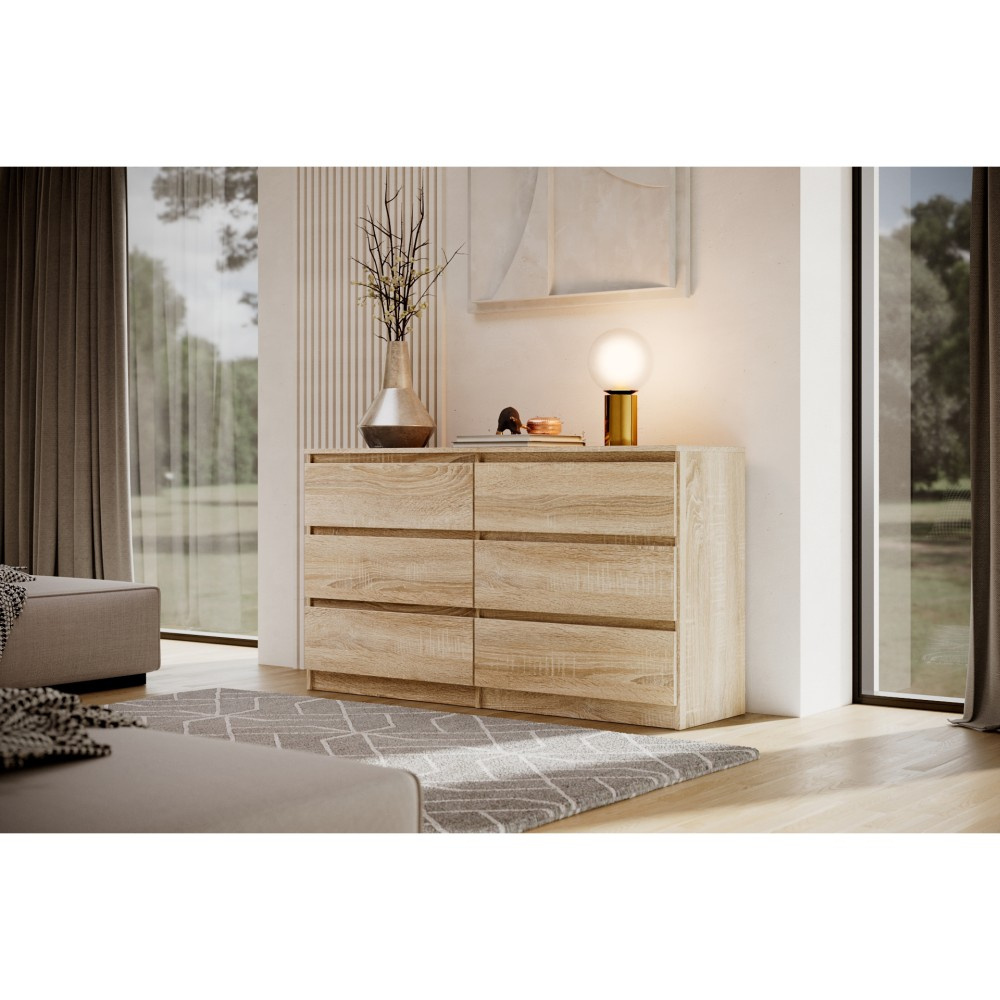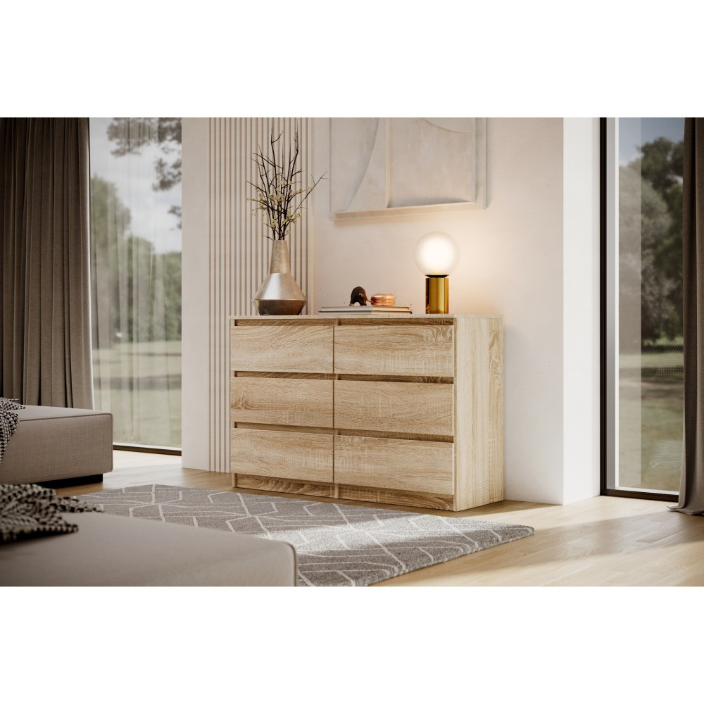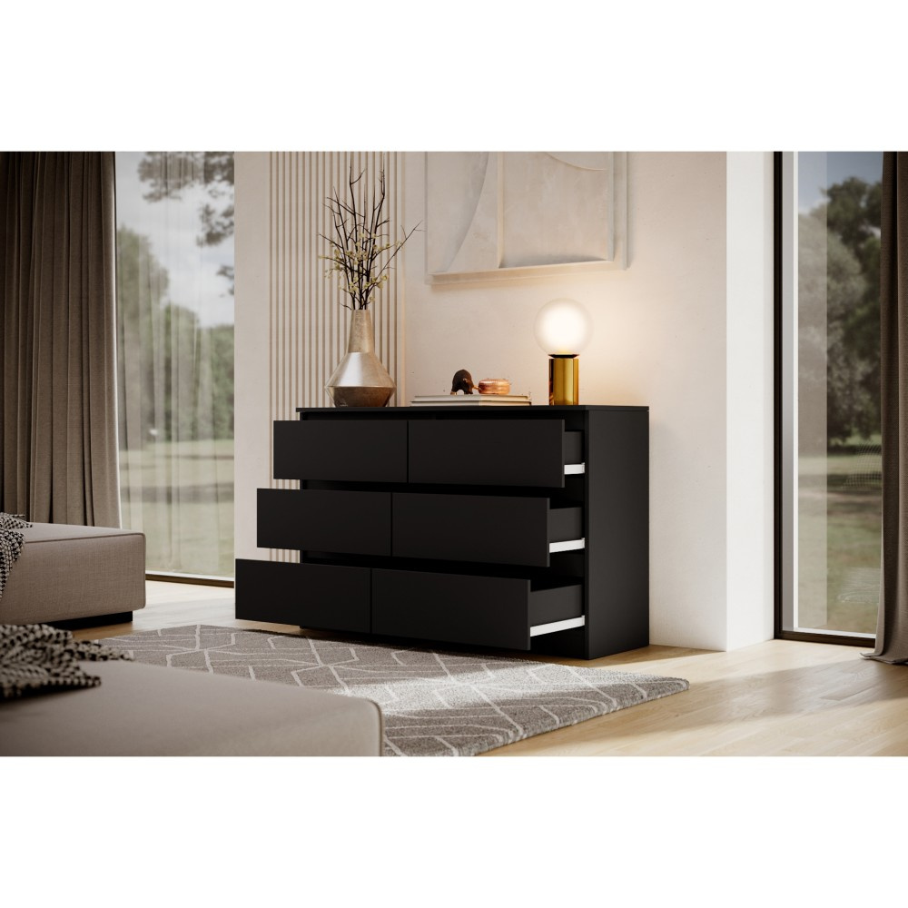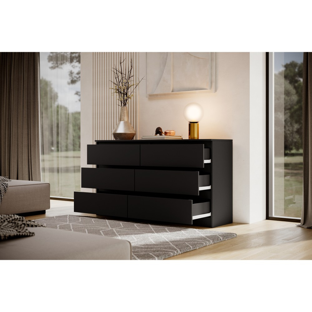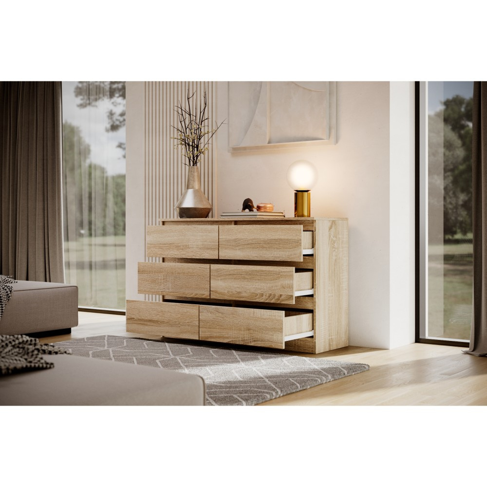 Komoda LINDA se šesti prostornými zásuvkami spojuje moderní design a praktická úložná řešení v jednom stylovém kusu nábytku. S šířkou 120 cm nebo 140 cm nabízí velkorysý úložný prostor pro vaše věci a je tak ideální pro ložnici, chodbu nebo obývací pokoj. Šest zásuvek je vybaveno stabilními vodítky, která umožňují snadné a tiché otevírání a zavírání, což z nich činí ideální řešení pro každodenní použití. Komoda je k dispozici ve třech vkusných barevných variantách, takže se může bez problémů začlenit do různých konceptů místností. Bílá verze dodává světlý, vzdušný nádech, černé provedení přináší elegantní, moderní atmosféru a varianta Sonoma přidává teplo a přirozenost. Pro zvláštní eleganci jsou modely v bílé a černé barvě také k dispozici v vysokém lesku, což místnosti dodává moderní a luxusní akcent. Se svým čistým designem a množstvím zásuvek je komoda LINDA se šesti zásuvkami ideálním řešením pro všechny, kteří hledají stylový úložný prostor a jednoduchou estetiku. Ať už jde o oblečení, doplňky nebo jiné předměty – tato komoda nabízí spoustu místa a přináší pořádek a eleganci do každé místnosti.
