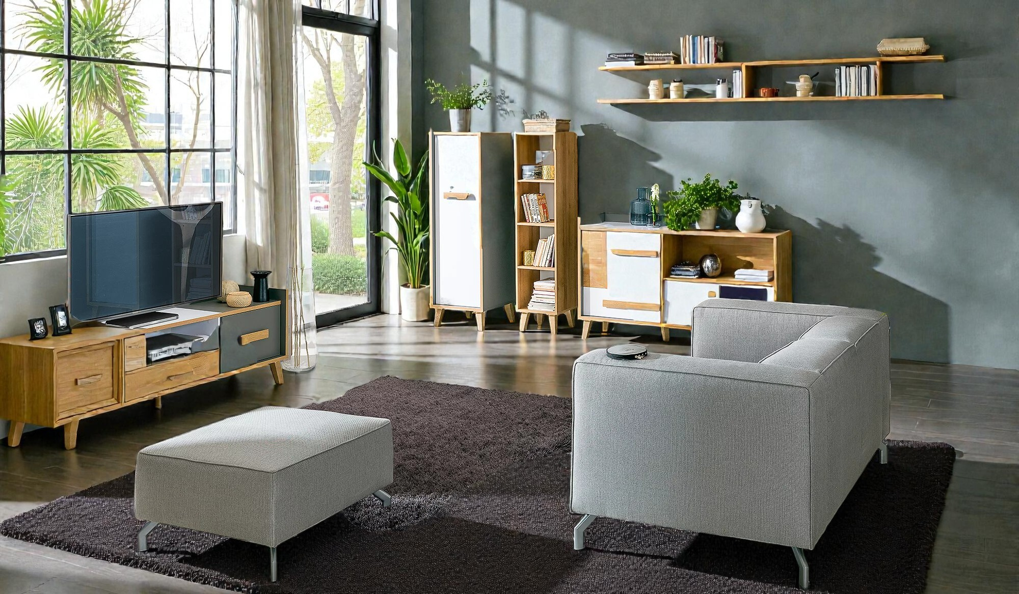 - Snadné kombinování: Trojkombinace barev (dub/bílá/šedá) vám dává svobodu při výběru doplňků – od pastelových polštářů až po tmavé koberce.
