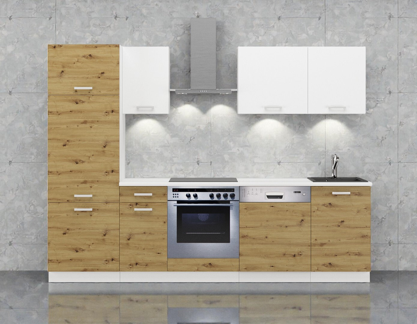 Proč zvolit tuto sestavu? Díky promyšlené šířce 270 cm je tato linka ideální do panelových bytů nebo garsoniér, kde je potřeba na malý prostor umístit lednici, troubu i myčku bez estetických kompromisů.