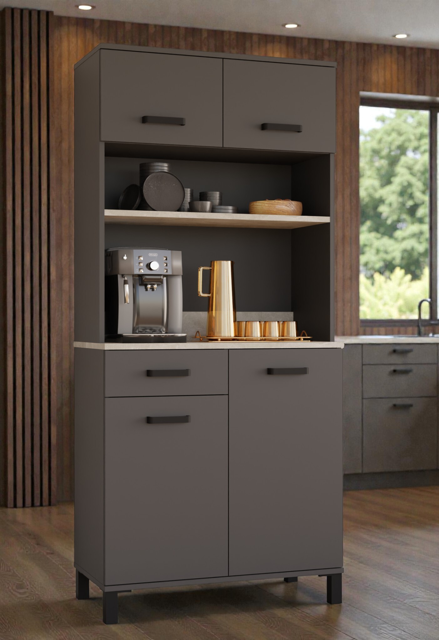 Hledáte úložný prostor, který vypadá stejně dobře jako funguje? Tento kredenc kombinuje tmavé, matné tóny s texturou betonu a vytváří tak nadčasový kus nábytku v "loftovém" stylu.
