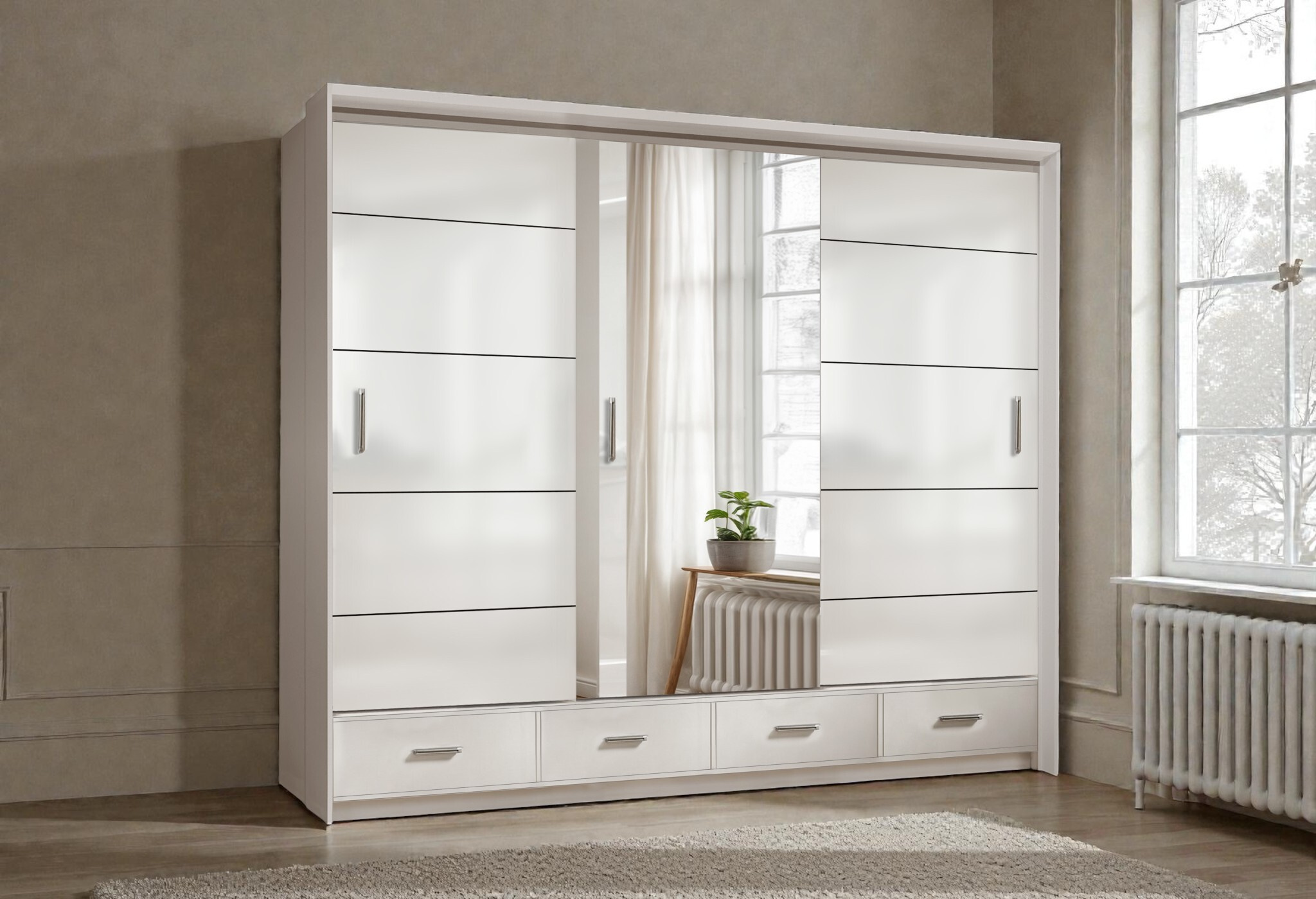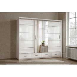 Díky své robustní konstrukci a výšce se tato skříň stává v podstatě vestavěnou šatnou, kterou však můžete v případě stěhování rozebrat. Posuvný systém šetří místo a vysoký lesk z ní dělá nadčasový kus nábytku.