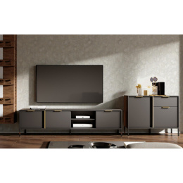 Design kolekce Tereno sází na kontrast: temná elegance antracitu je protnuta dekorativním zlatým ABS obložením na vnitřních příčkách a doplněna subtilními zlatými úchyty. Tento neotřelý prvek dodává nábytku hloubku a neopakovatelný šmrnc.
