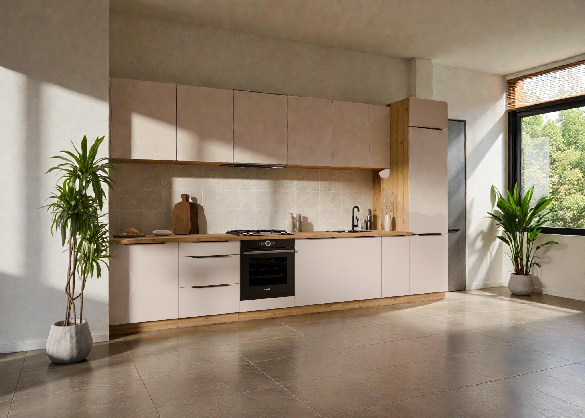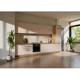 Představujeme vám kuchyňskou sestavu, která vnáší do domova klid a sofistikovanost. Kombinace jemného kašmírového odstínu a přírodního dekoru dubu artisan vytváří moderní, ale přitom velmi útulný prostor. Tato kuchyně je ideální volbou pro ty, kteří hledají eleganci bez chladu a kladou důraz na detail.