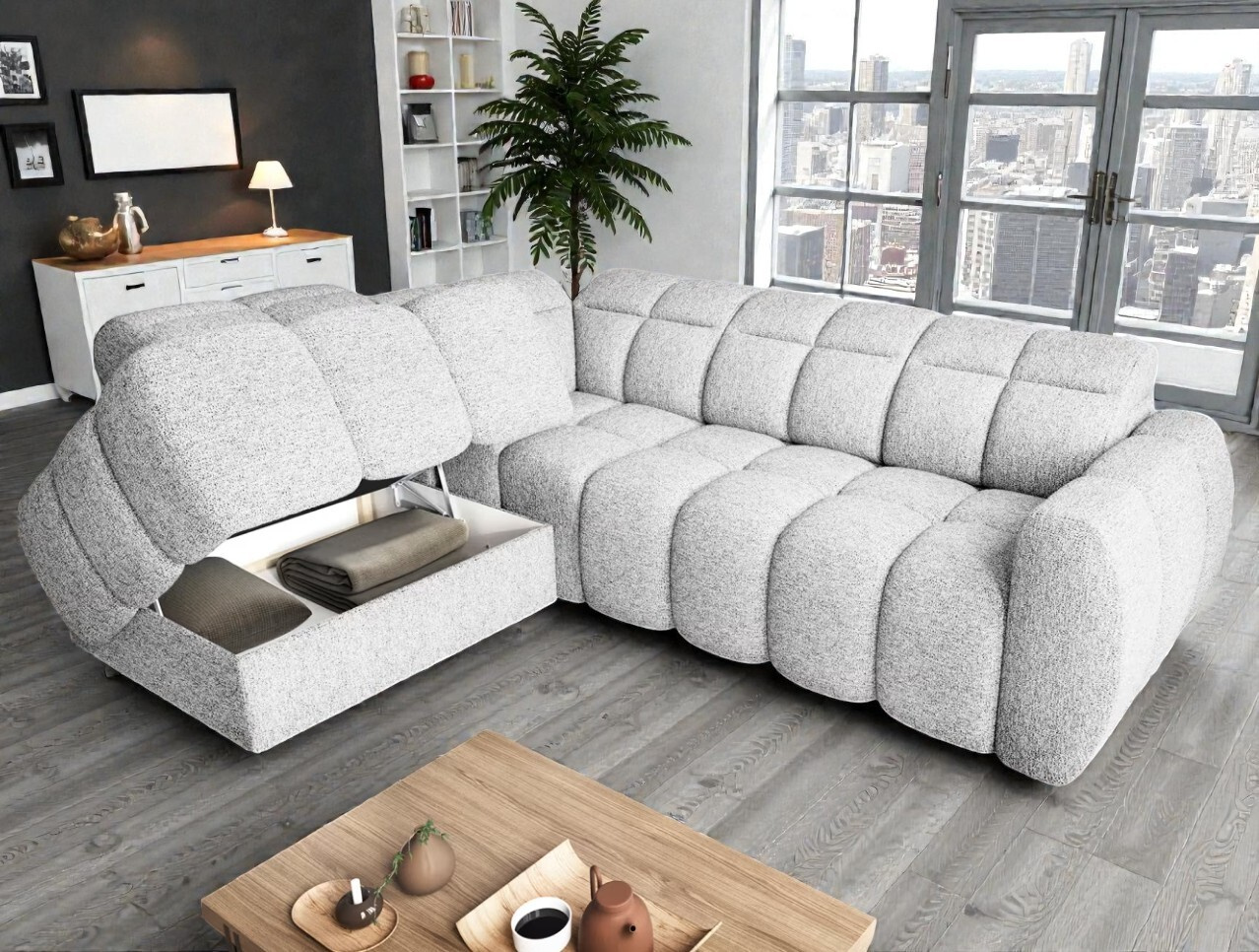 Sedací souprava Aspen představuje špičku mezi moderním čalouněným nábytkem. Tento elegantní model ve tvaru písmene L v sobě snoubí čistý minimalistický design s inovativní technologií. Hlavní předností, která Aspen odlišuje od běžných sedaček, je elektricky výsuvný mechanismus sedáku, který vám umožní přizpůsobit si hloubku relaxační zóny přesně podle vašich aktuálních preferencí pouhým stisknutím tlačítka.
