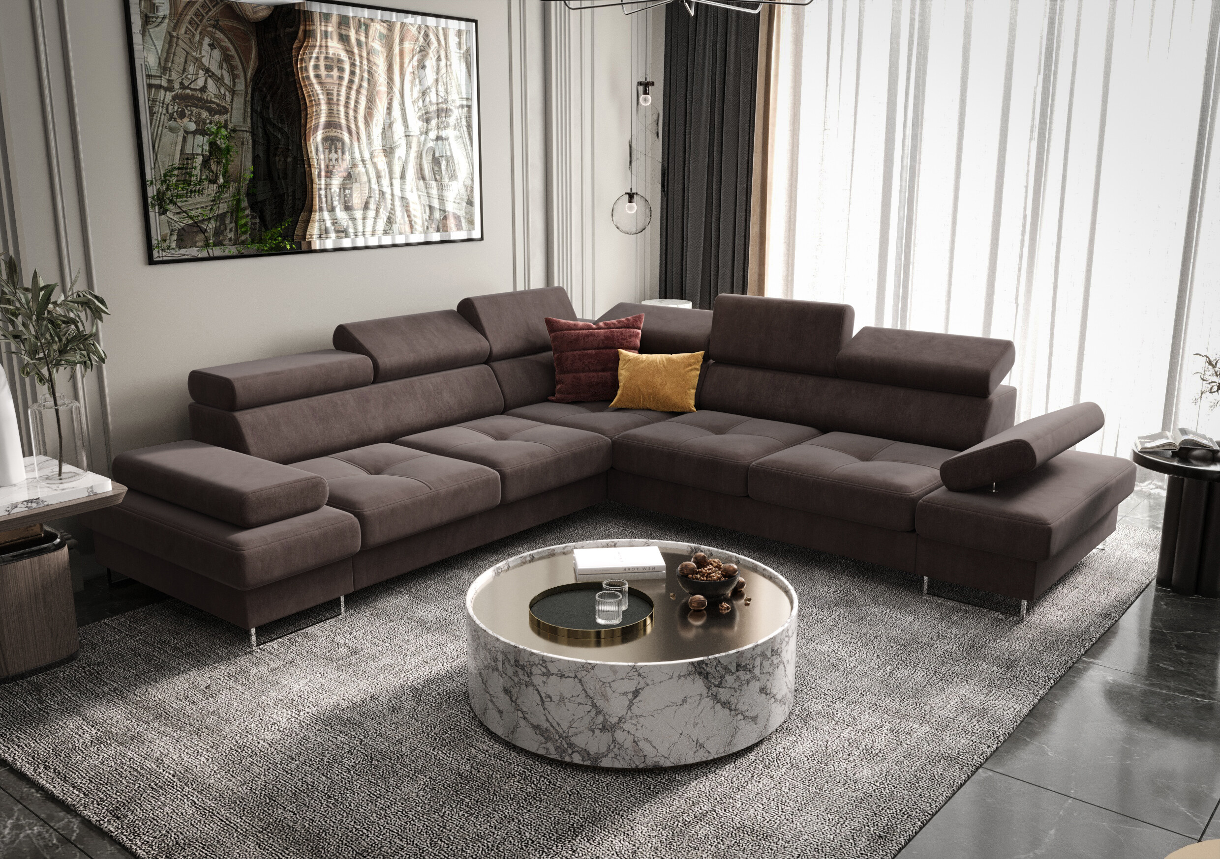 Regulovatelné pohodlí: Sedačka je vybavena polohovatelnými záhlavníky, které vám umožní nastavit si opěru hlavy přesně podle potřeby. Navíc disponuje nastavitelnou područkou, která posouvá komfort při ležení či sezení na novou úroveň.