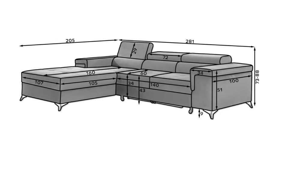 Sedací souprava Relina je ideální volbou pro ty, kteří hledají stylový nábytek s promyšlenými detaily. Její klasická, pevná silueta je obohacena o moderní prvky, jako jsou chromované nohy a polohovatelné záhlavníky, které dodávají celku dynamický vzhled. S rozměry 281 x 205 cm poskytuje velkorysý prostor pro každodenní relaxaci i společné chvíle s rodinou.