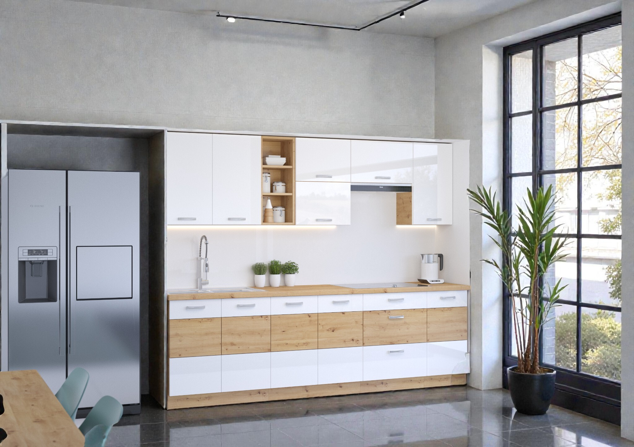 Kuchyně Delta: Moderní lesk v objetí dubu s bílým leskem