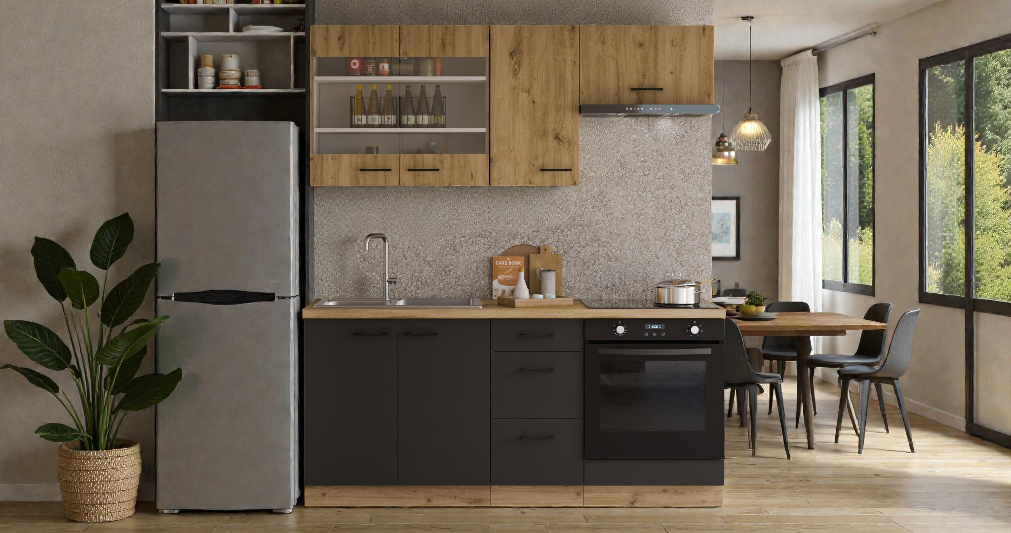 Hledáte kuchyni, která definuje moderní interiér? Tato sestava kombinuje teplý dekor dubu artisan s elegantním černým matem. Výsledkem je vysoce stylový, nadčasový vzhled, který se skvěle hodí do moderních bytů i otevřených loftových prostor.