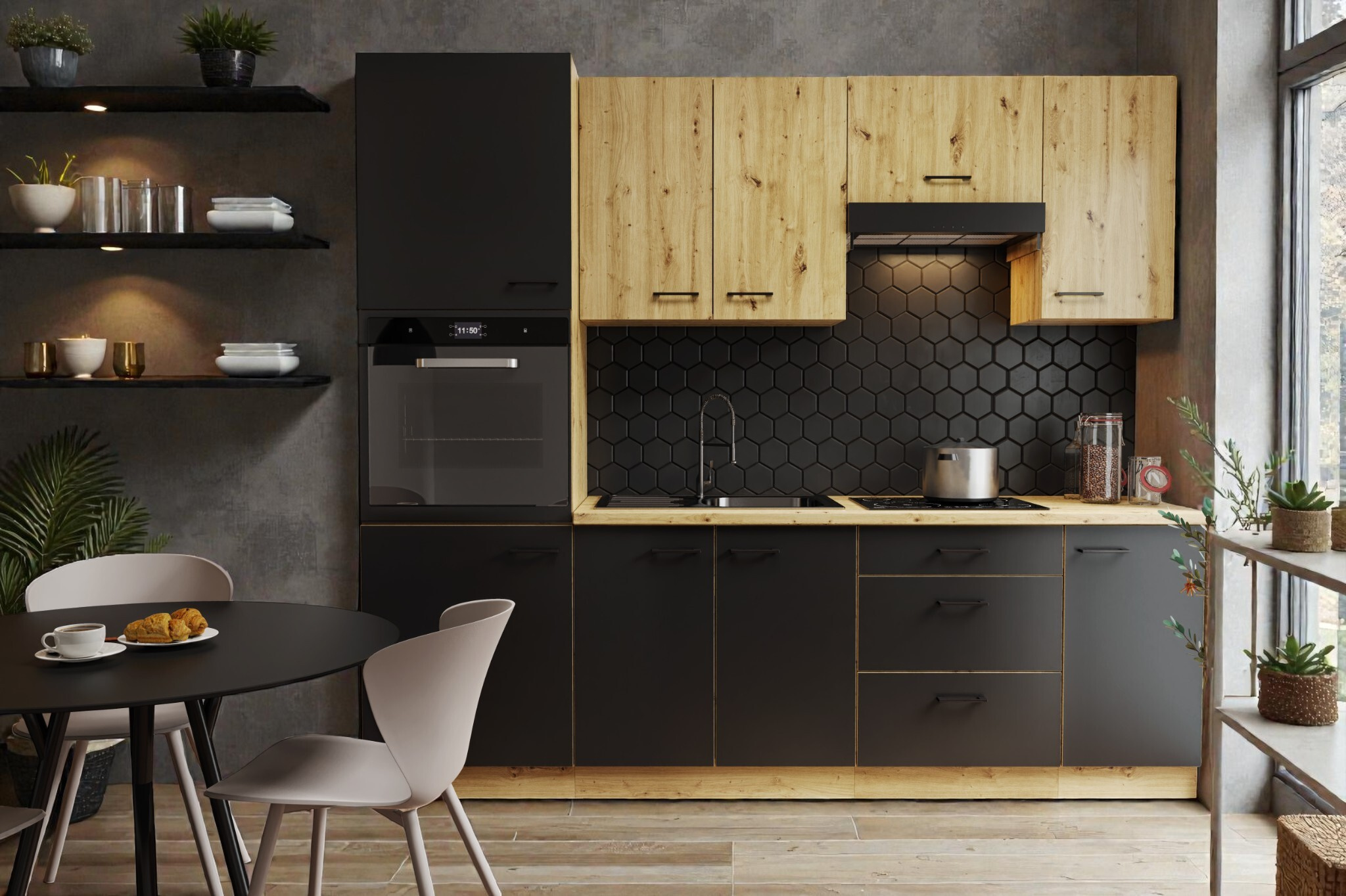 Moderní kuchyně v kontrastním designu: Dub Artisan & Černý mat