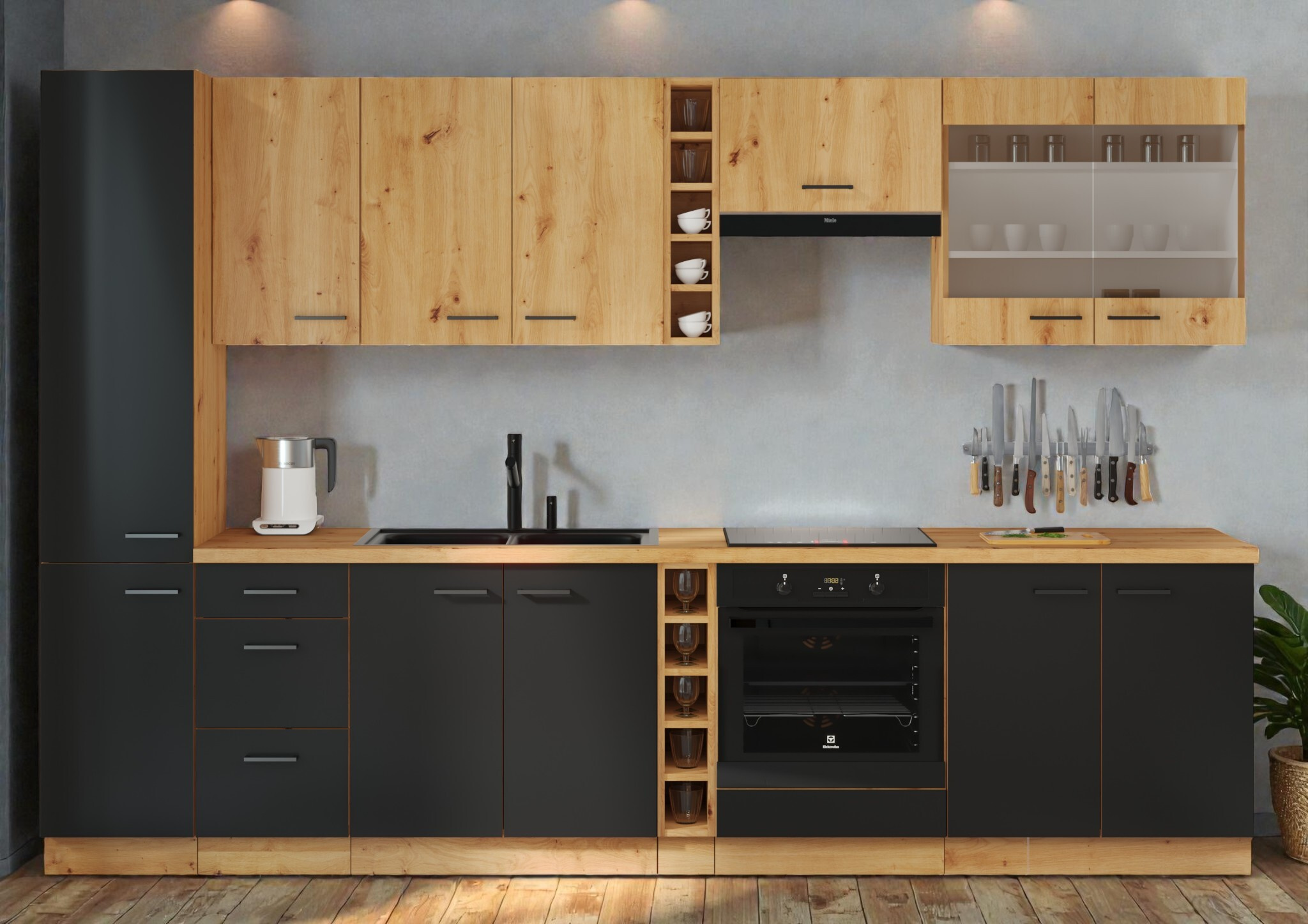 Hledáte kuchyni, která definuje moderní interiér? Tato sestava kombinuje teplý dekor dubu artisan s elegantním černým matem. Výsledkem je vysoce stylový, nadčasový vzhled, který se skvěle hodí do moderních bytů i otevřených loftových prostor.