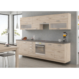 - Autentický vzhled: Přední plochy i korpusy jsou sladěny v dekoru Dub bordeaux, který věrně imituje přírodní dřevo a dodává kuchyni robustní charakter.